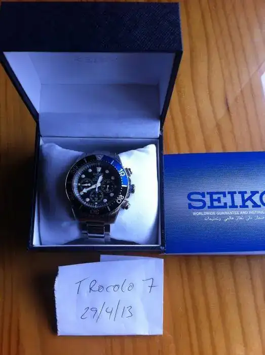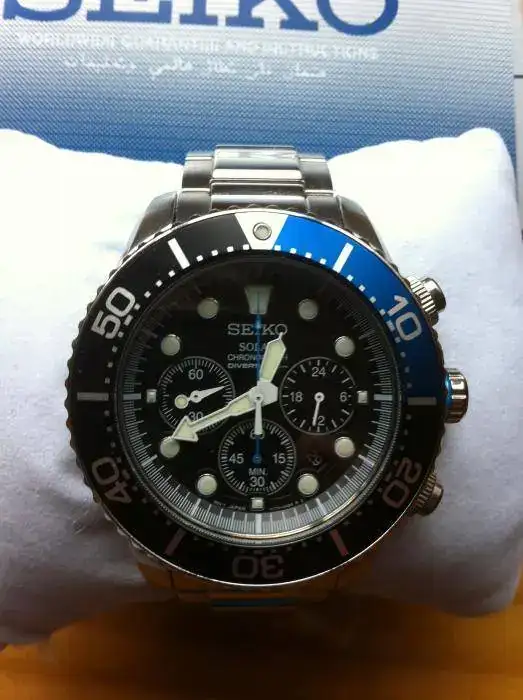 Vendo este Seiko Solar Diver en perfecto estado de revista, sin marca alguna ni pelo que valga. Está dentro de garantía, ya que tiene un mes escaso de vida, así que 11 meses por delante. La caja es de 44 mm. y aunque parezca aparatoso es muy cómodo de llevar y no pesa una burrada comparado con otros de las mismas medidas y características. El bisel es bicolor, azul y negro, realmente bonito. El mecanismo es de cuarzo. Carga energía tanto de luz natural como de artificial y tiene una reserva de carga de 6 meses. Viene con su caja, manual, eslabones y garantía. El precio, 175 con envío incluido.