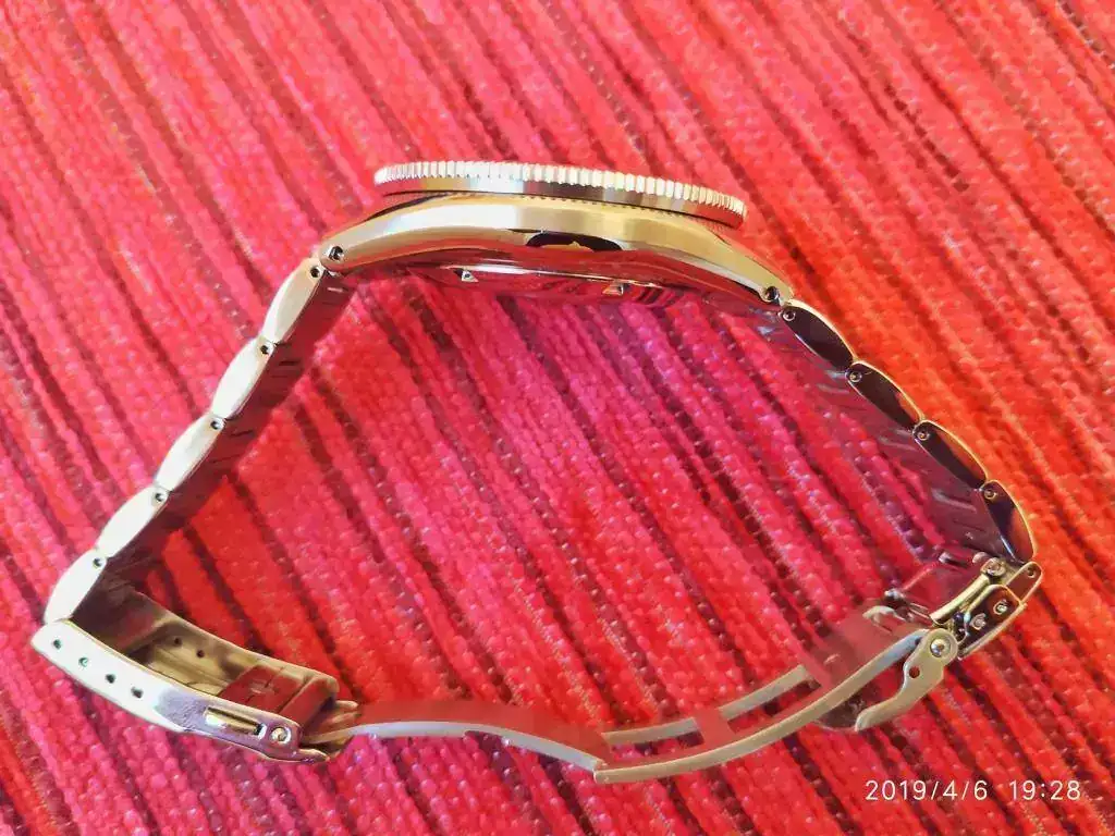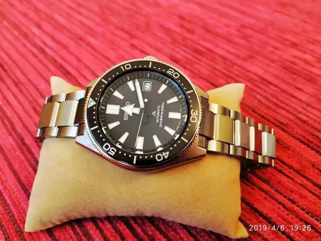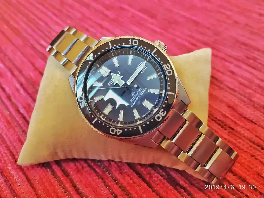 La calidad del reloj es impresionante en vivo, nada que ver con otros que he tenido. El trabajo de la caja, la calidad de la esfera, el bisel ¿cerámico?, cristal de zafiro con AR antireflejos por la parte interna, el trabajo del brazalete, o el cierre sólido y robusto, no tienen nada que ver con otros modelos. La waffle parece hecha a medida para darle ese aspecto retro total, y con el cierre desplegable hacerlo comodísimo. Lleva el tratamiento de endurecido para prevenir arañazos de Seiko, el Diashield.