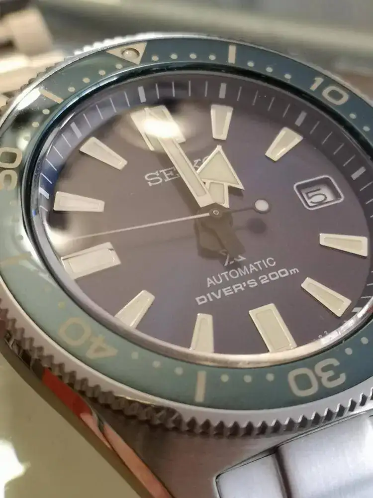 Creo que a nadie se le escapa la calidad de este reloj, con una caja muy bien elaborada con superficies matizadas y pulidas, de 42,6 mm de diámetro que se hacen muy llevables gracias a la comedida distancia estre asas. El fondo es roscado y ciego, decorado con un grabado de la gran ola de Kanagawa, lo que, unido a la corona roscada, le dan una hermeticidad de 200 metros. Bajo el crisal de zafiro encontramos una esfera de un intenso color azul que adquiere distintos matices en función de la luz, al igual que el bisel unidireccional de 120 pasos. Desgraciadamente no he podido captar en mis fotografías esos colores. En su interior lleva un calibre manufactura 6R15.