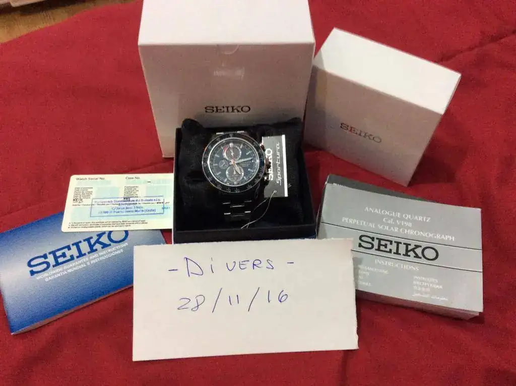 Hace dos semanas me llegó este precioso Seiko que me encanta, y cosas de la vida, tengo la oportunidad (ahora) de en diciembre hacerme con un suizo auto que me lleva loco. Así que a hacer caja toca. El reloj está NUEVO, no ha salido a la calle ni nada. Le ajusté el armis y vuelta a la caja. Es un reloj azul muy bonito, pero todos no pueden estar. Es solar, calendario perpétuo, chrono, alarma, armis, cristal de ZAFIRO, cierre....
