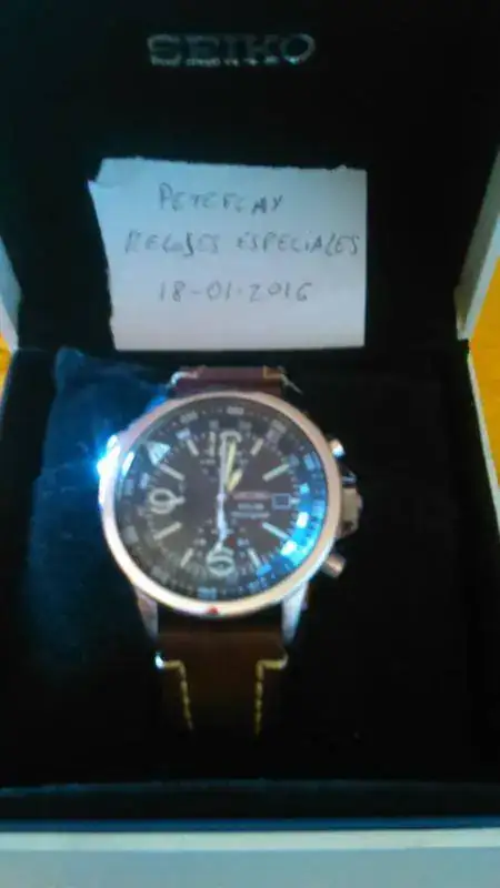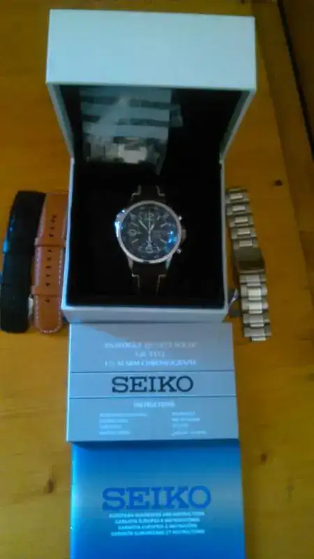 Con muchísimas dudas, porque me encanta, saco a la venta este Seiko crono solar. Como he dicho antes, me gusta mucho, pero la verdad es que apenas lo uso, y muchas veces cuando me lo pongo termino cambiando y poniéndome otro. Así que he decidido venderlo. El reloj está comprado en noviembre de 2013 en CO físico, así que la garantía ya está caducada, pero está perfecto y funciona de maravilla. Carga muy bien, ya que en estos dos años y poco que lo tengo no se ha descargado ninguna vez (estos días le he dado un buen "chute" de luz solar, así que en principio tiene un buen nivel de carga). La caja es de 42mm sin la corona, y el cristal es hardlex abombado, lo que le da una legibilidad buenísima, lo mismo que el lumen, que es potentísimo. Esta referencia viene con la correa de cuero marrón claro (que apenas he usado), pero yo me agencié el armis de su versión con brazalete, que también adjunto, el cual es muy cómodo (de hecho es el armis más cómodo de los que tengo y he tenido), con la parte central pulida y los costados cepillados, y los eslabones sólidos. El cierre tiene microajuste. También adjunto dos correas de cuero Hirsch, una Liberty marrón y una Runner negra, ambas usadas con frecuencia, pero en muy buen estado (decir que las tres correas llevan agujeros adicionales hechos por mí, para ajustarlas a mi muñequita). Lo envío con toda la documentación y dotación: caja original, instrucciones, garantía (caducada) y eslabones sobrantes.