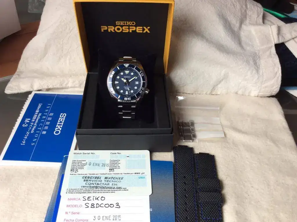 Buenos días, vendo este Sumo por no usarlo. Muy buen estado general, las típicas rayitas en el cierre. El bisel y cristal perfectos. Garantía hasta enero de 2017 (comprado en mercantes en enero de 2015) documentación, cajas, eslabones...etc. Regalo un caucho negro con pespunte azul adaptado a los end links que le queda de lujo. Precio 365 envío Correos asegurado. No cambios. Gracias.