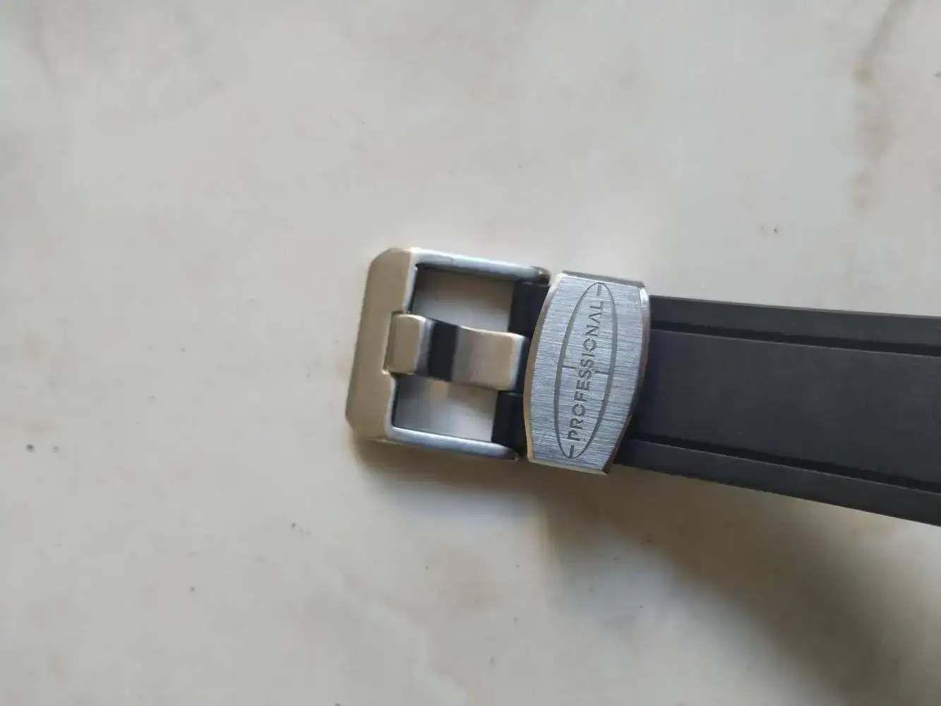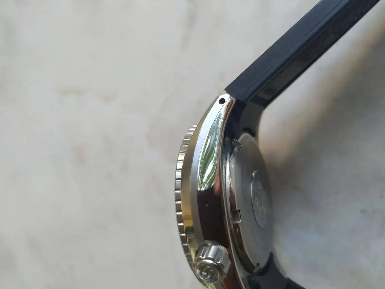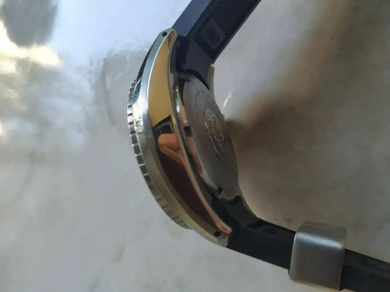 Como peros a señalar, tiene una pequeña mella en la parte exterior del bisel, en la parte metálica, y un leve arañazo en el cristal, en el cuarto cuadrante. He intentado que salga en las fotos lo mejor posible, y si necesitáis más fotos os las envío sin problemas,
