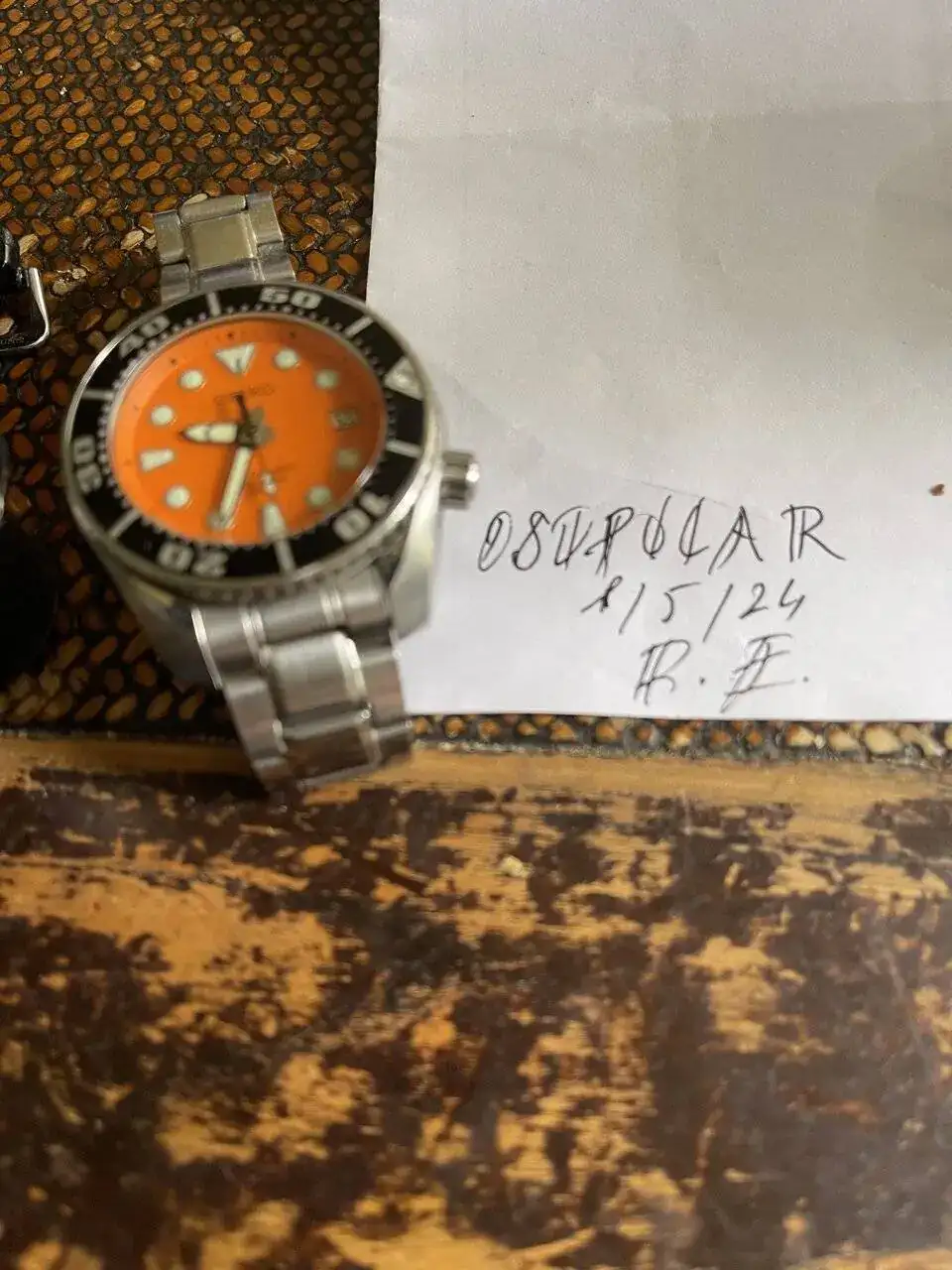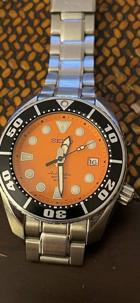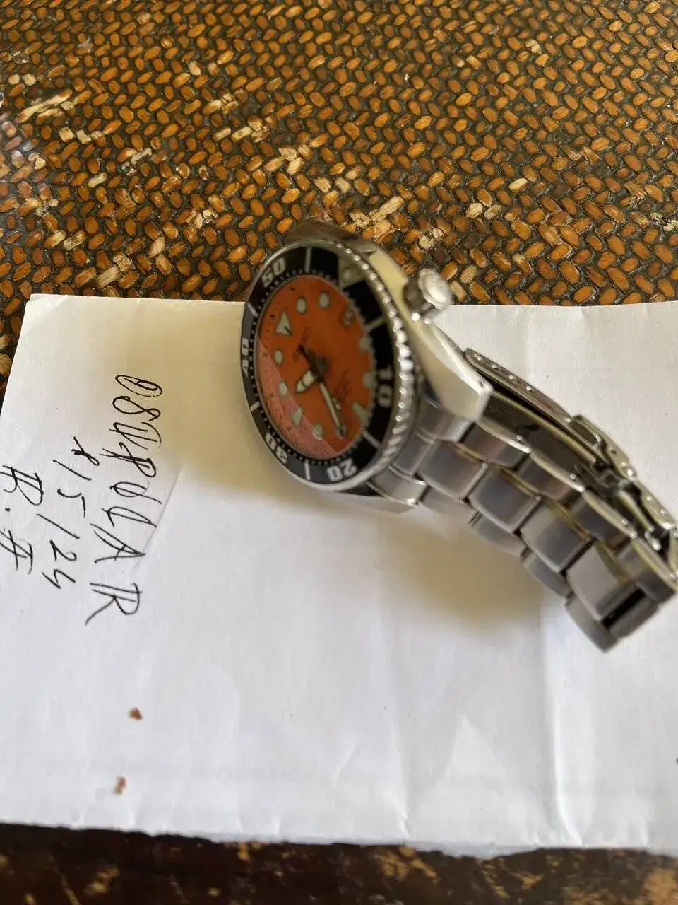 Esfera color naranja, con agujas perfiladas en negro y marcadores horarios luminiscentes (perfecta visibilidad en la oscuridad).