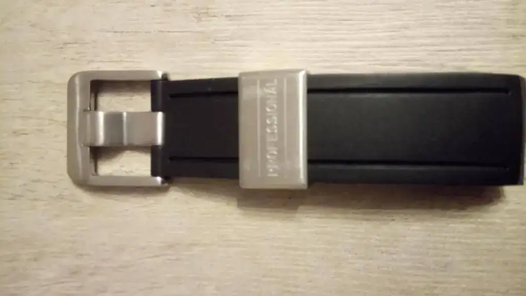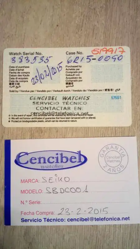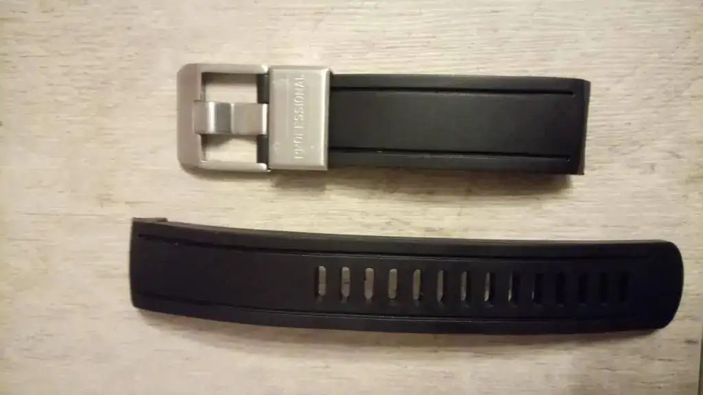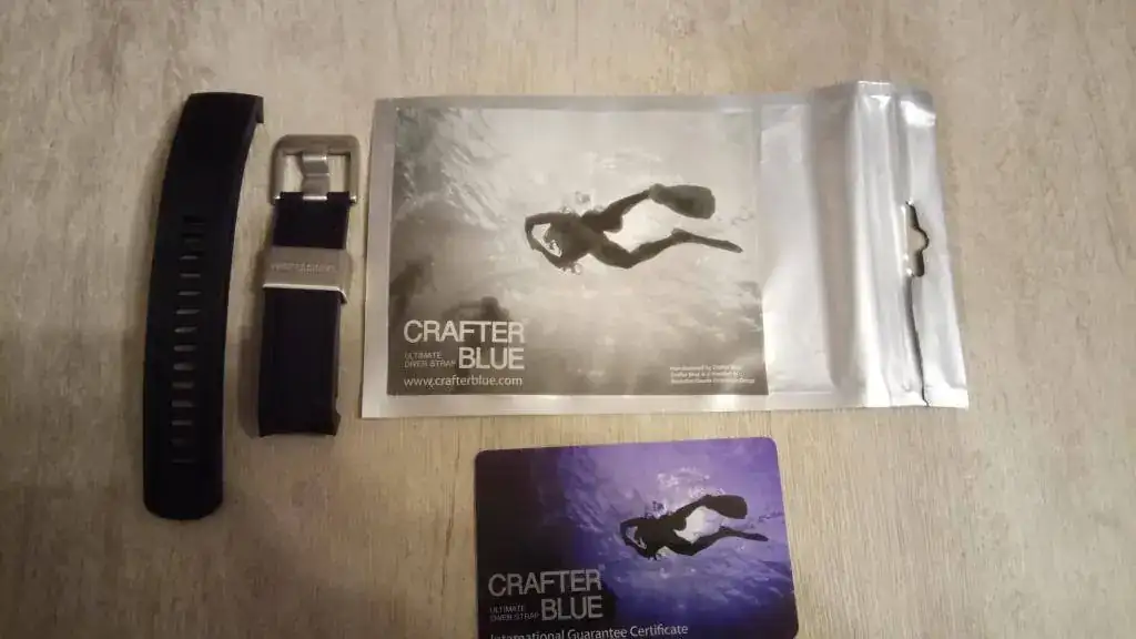 Además, adjunto la correa de caucho CrafterBlue, diseñada específicamente para este reloj, que se le adapta como un guante eliminando el espacio entre la caja y las asas, junto con su embalaje original y tarjeta con número de referencia. Es una correa de muy buena calidad y gruesa, y aunque la he usado con frecuencia durante dos veranos está perfecta, salvo el pasador, que tiene algunas marcas de uso.