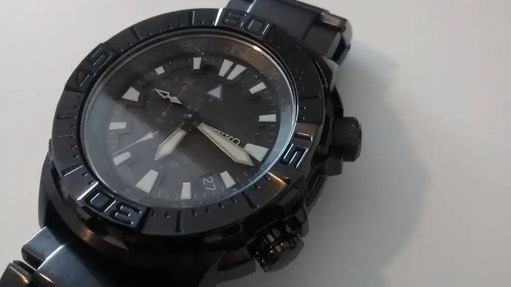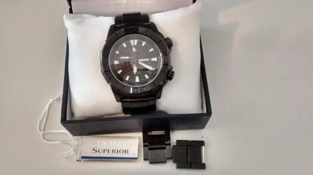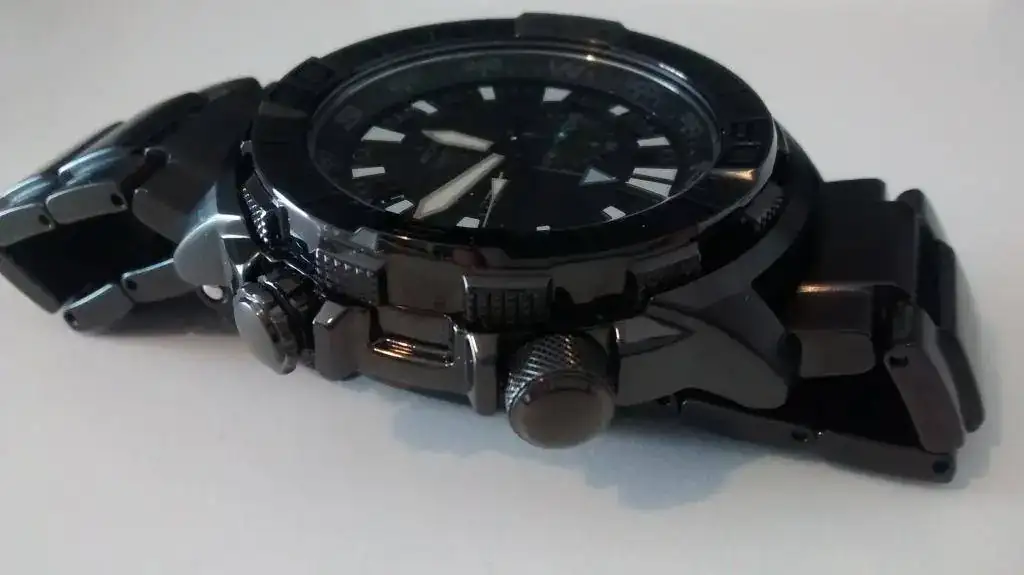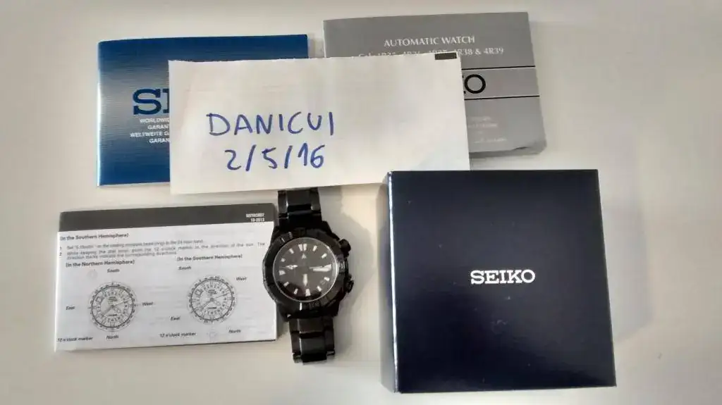Bueno, pues aquí está... este Seiko Superior de acero con PVD negrito que se ve muuuuy poco por aquí. Lleva un calibre 4R37, automático con remonte manual y parada de segundero... tiene bisel unidireccional en el mismo PVD que el resto del reloj, un bisel interno para brújula que se gira con la corona de abajo (incluye instrucciones de cómo usar la brújula), un pequeño indicador de 24 h entre 9-12, fechador entre 4-5. Resistencia al agua 100 M. Y un lumen bastante poderoso típico de Seiko. En fin, un reloj bastante completito y contundente, aunque no de tamaño exagerado.