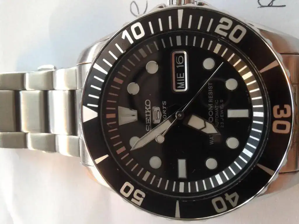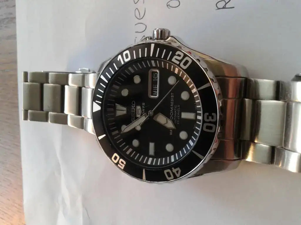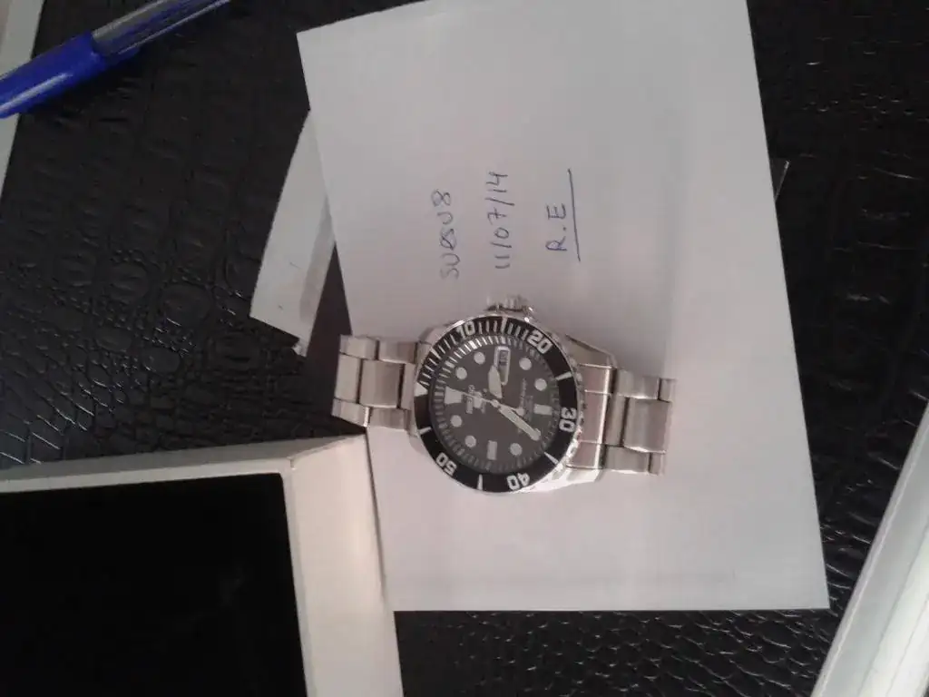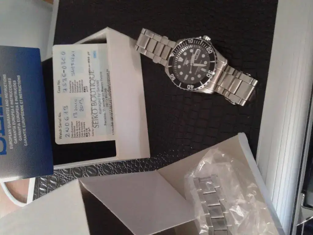 Pues saco a la venta este seiko con toda su dotación comprado por mi en la boutique de Seiko de Madrid el 13 de Julio de 2013, por lo que aún tiene un año de garantía por delante. El reloj está tal como se ve en las fotos. Como sabeis, las marquitas se ven más en fotos que al natural, pero así no hay problemas. Pequeños micro puntitos en el bisel, que podeis ver perfectamente en foto (al natural no se ve tanto). El cristal no tiene nada, si veis algo en las fotos son motitas de polvo.Funcionando perfectamente, como buen seiko que es. En realidad ha tenido muy poco uso, enseguida fue relegado al cajón sustituido por otros, y por eso lo vendo. Yo pagué 263 euros en tienda (adjunto ticket), y lo vendo en 150 euros, entrega en Mano en Madrid, o envio por correos certificado a cargo del comprador.