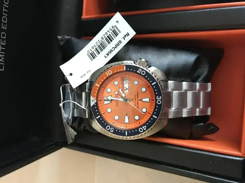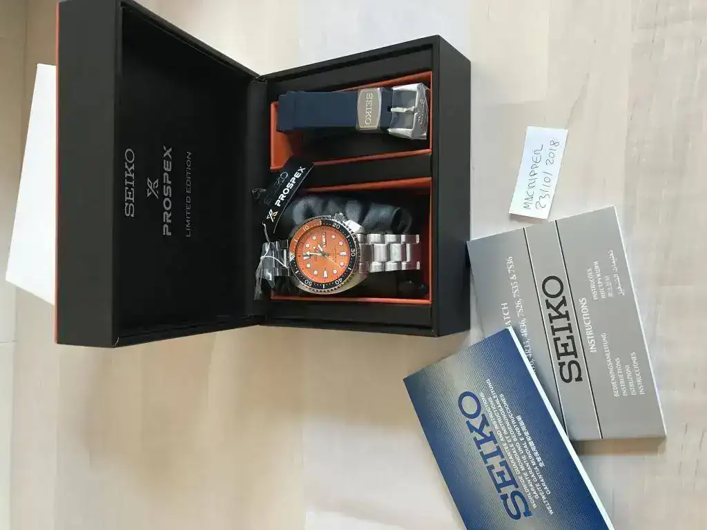 Hola, pongo a la venta este Seiko Tortuga Edición Limitada para el mercado asiático. Por cosas que no vienen al caso, tengo dos, así que uno tiene que salir. El reloj esta sin estrenar. Con caja edición limitada negra y naranja y caucho azul adicional. La documentación esta completa, pero la tarjeta de garantía esta sin sellar.
