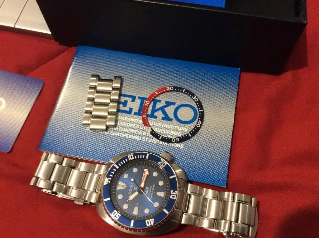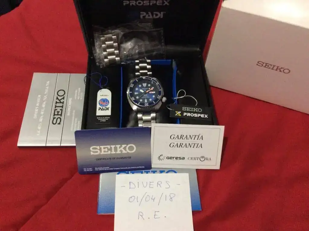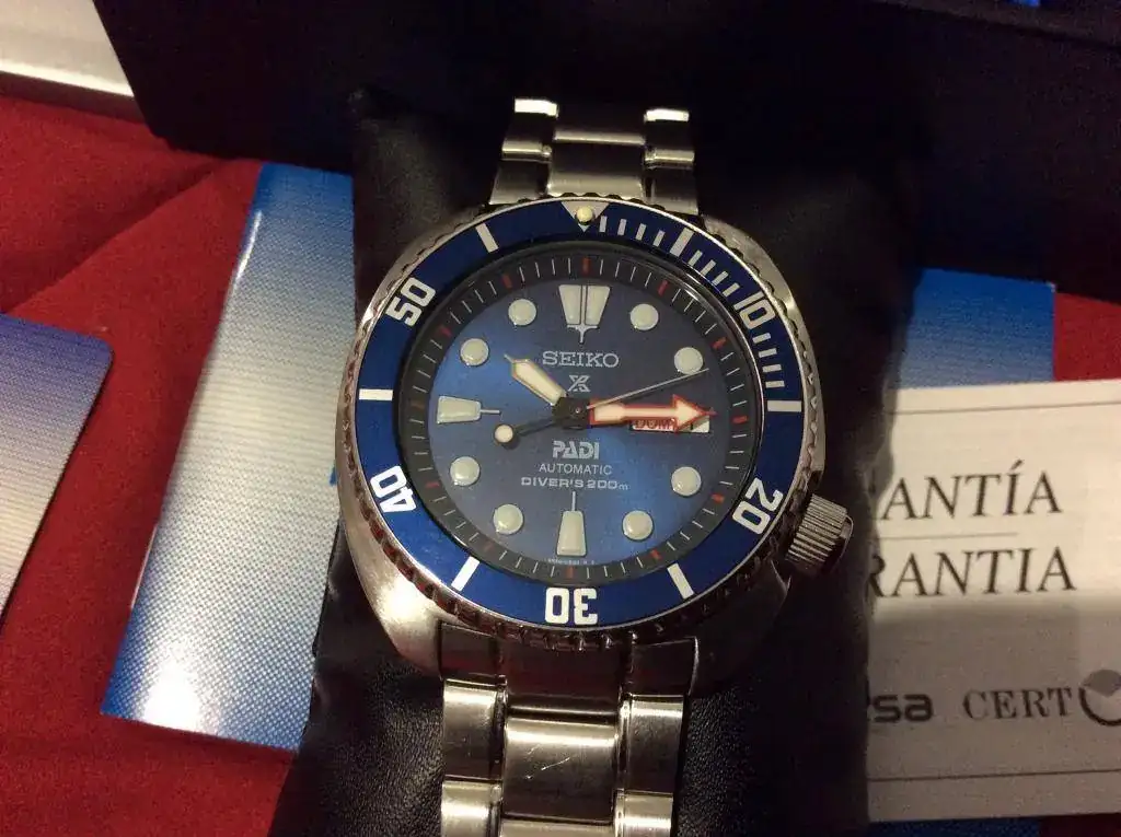 Seiko Tortuga Padi. Le cambié en mi relojero el bisel original rojo/azul por uno todo azul que compre nuevo y le queda de lujo (a mi gusto). Entrego el original nuevo. Va de marcha en + 3sg/día. Sólo ligeros pelillos en el cierre. Comprado en C.O. nacional con garantía de GERESA.