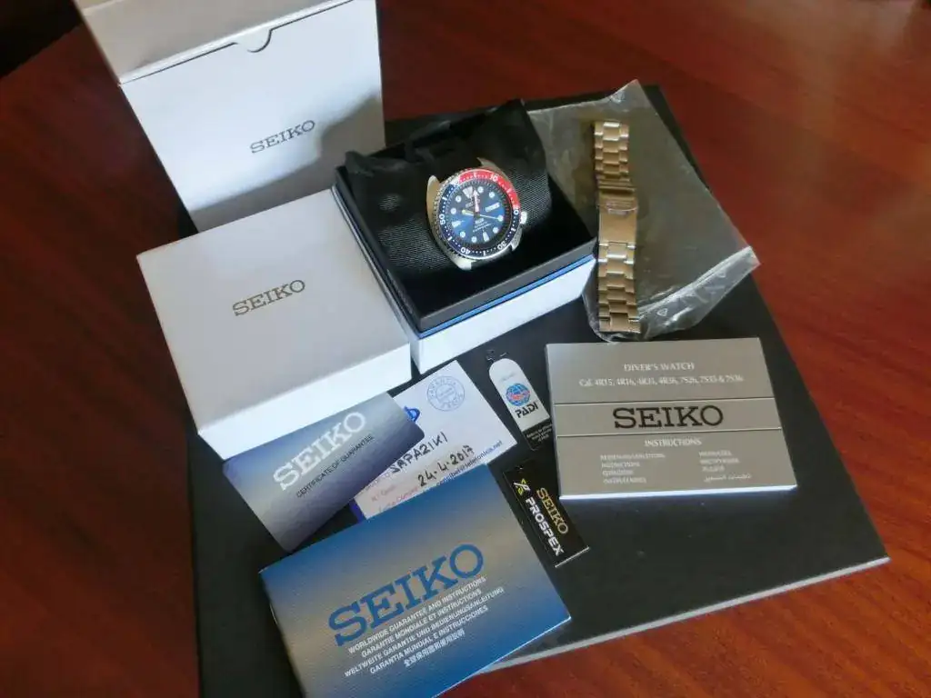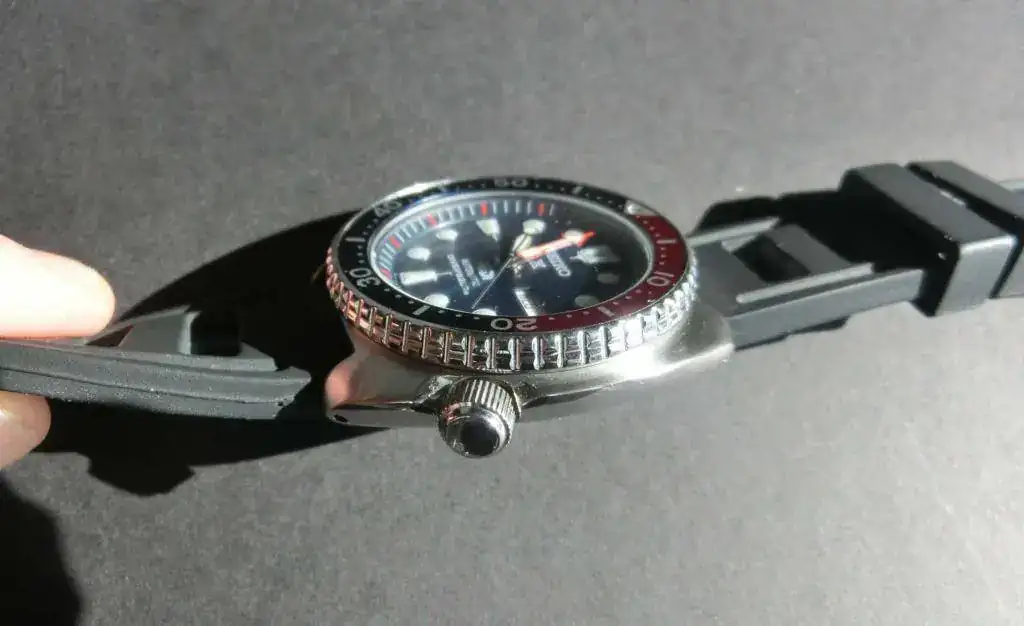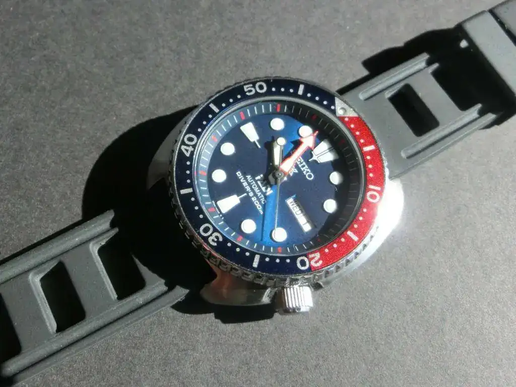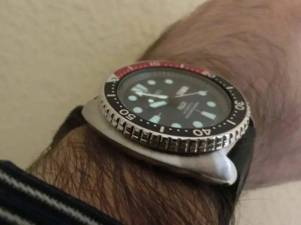 Aqui saco este conocidísimo modelo de Seiko, el PADI sin duda el mejor de la gama Tortuga. Me ha llegado recientemente de un cambio y en realidad me ha sorprendido bastante, no me esperaba tanto, me ha enamorado, con su color profundo y cambiante y sus destellos de rojo. El lumen y las marcas horarias son un espectáculo. La forma de la caja que no entendía hasta que no me lo probé, es una idea genial, una forma heredera de los primeros Doxa Sub de los años 60, en los que la caja se hace ancha para presentar un apoyo a los dedos (incluso llevando guantes) que pueden con mucha facilidad girar el bisel (más cómodamente que el SKX por ejemplo) y en la zona inferior queda mordida para liberar espacio y poder ser cómodo de llevar a pesar de su dimensión de 44, es un reloj más cómodo que otros que tengo de 42 mm, no es para nada una imitación al animalito, más bien el nombre no ayuda a entender bien el reloj.