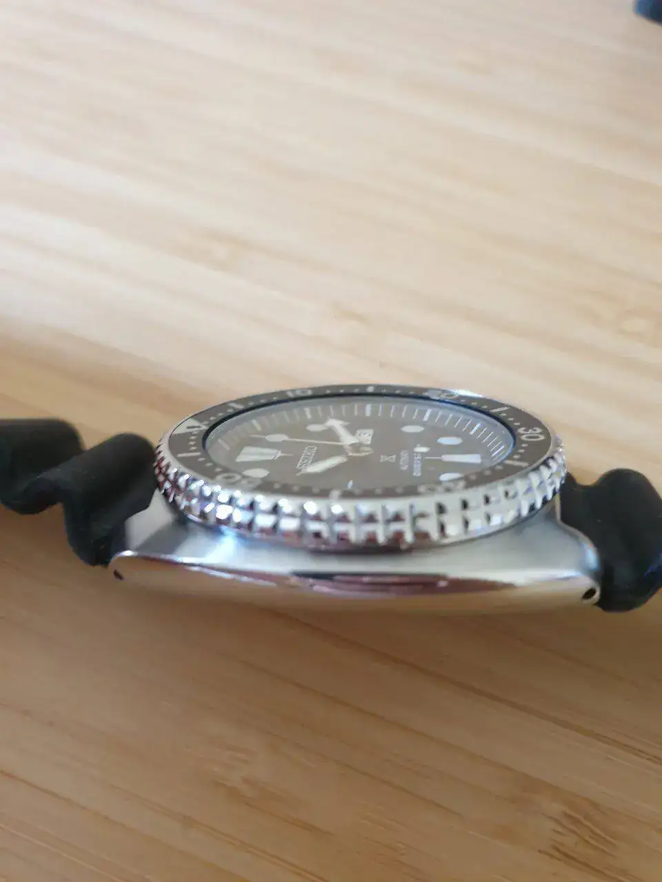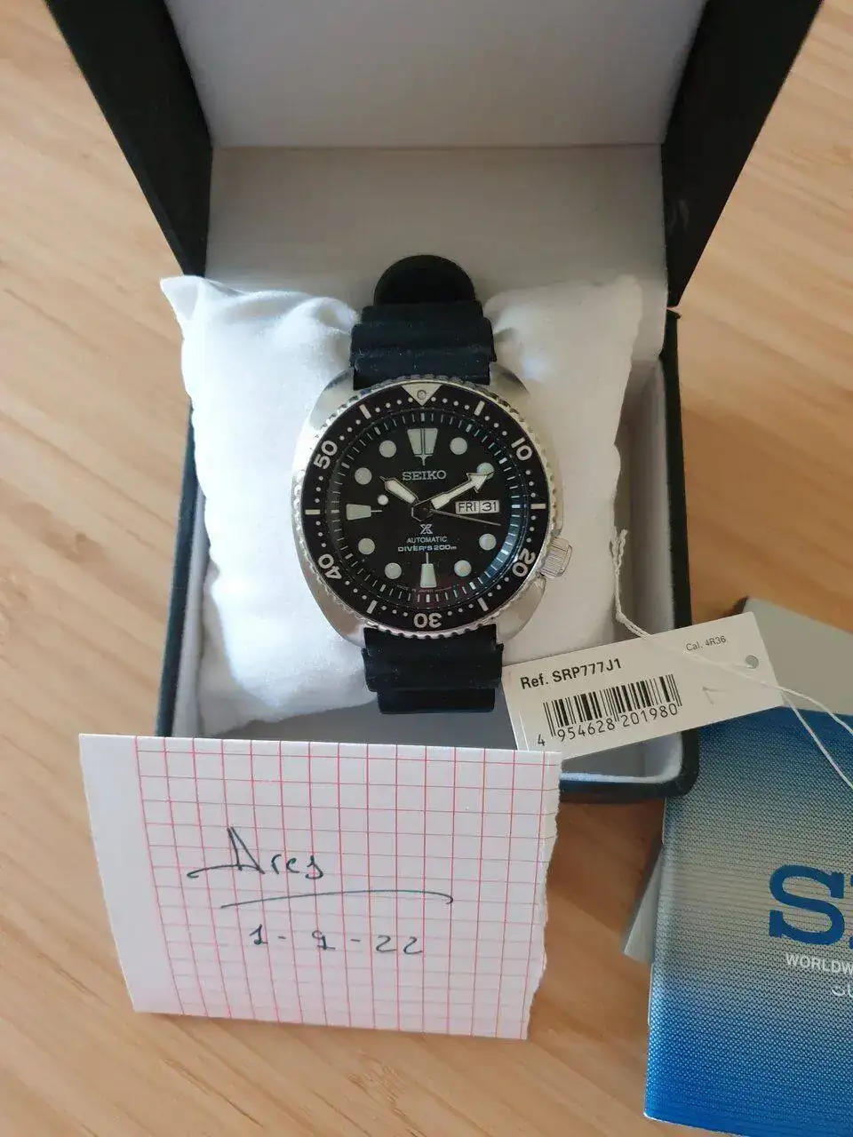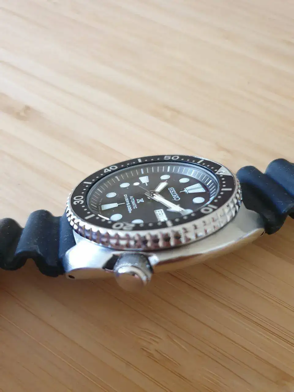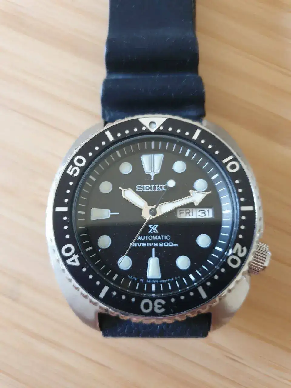 Buenos días, a la venta Seiko Turttle, la versión japonesa con calendario inglés/árabe. El reloj está usado y se nota en las típicas marcas y roces de un uso habitual. A destacar roce en bisel bajo el "20" que se aprecia en las fotos. De marcha y reserva va bien con leve tendencia a adelantar. El caucho original que lleva apenás se ha usado.