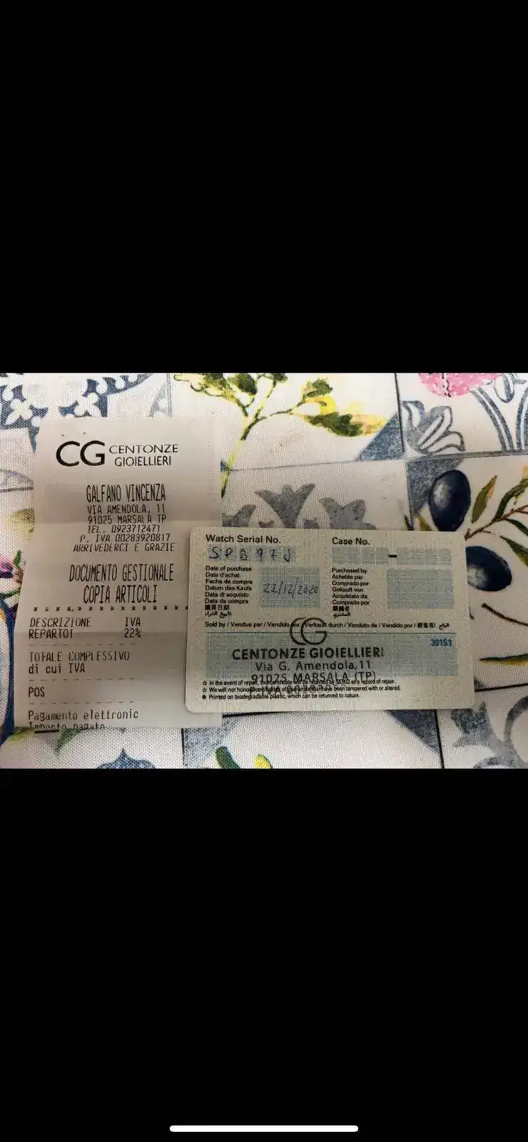 La persona a la que compré el reloj perdió la tarjeta de garantía solo conserva el ticket de compra y su tarjeta de garantía en la foto que le hizo que es la que pongo aquí pero repito no tengo la tarjeta física (fue comprado en Centonze Gioiellieri en Italia)