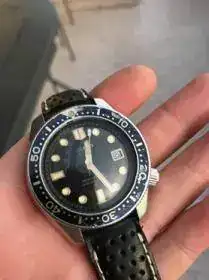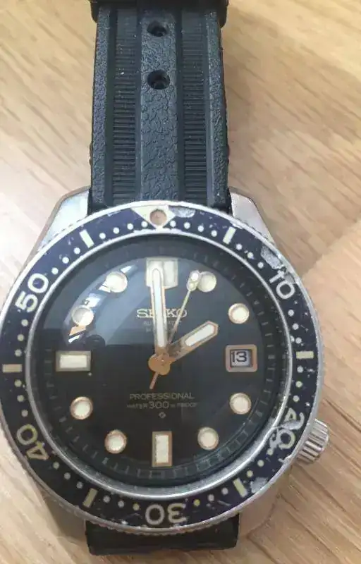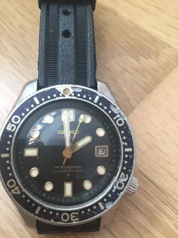 Empiezo con el mítico Seiko 6159-7001 hi-beat. Primer diver "Professional" Seiko, creado en 1969, con caja monobloque de acero, 300 metros de resistencia al agua y un calibre de alta frecuencia, 36.000alt. usado en Gran Seiko, todo un ejemplo de la relojería de la más alta calidad en un reloj herramienta que pone el listo inalcanzable para el resto de firmas del momento. Este modelo ha sido puesto al día y afinado por un afamado relojero europeo especializado en Seiko, y pese a tener algún deterioro en bisel y caja, propios del uso que recibió, es todo un grial para cualquier aficionado. El movimiento fluido y continuo de su aguja segundera es único. Aquí posa con una correa aftermarket de su original, no dispongo de la misma. Lo uso a menudo con esta otra correa de cuero que ya mostré en otro hilo, mejor para el diario que el caucho.