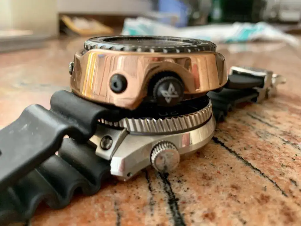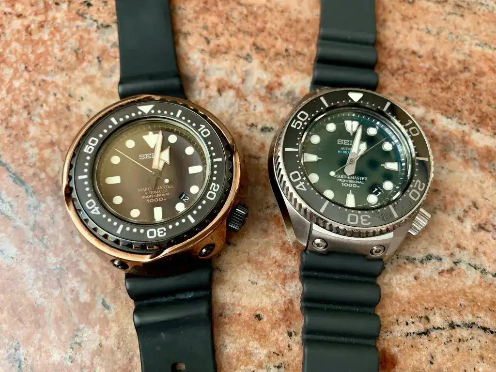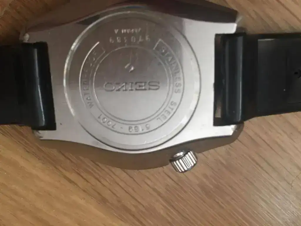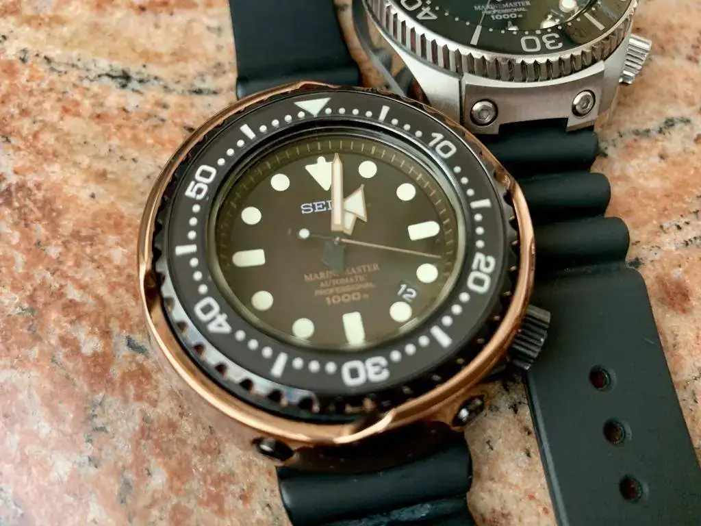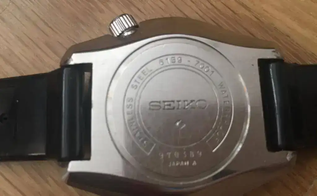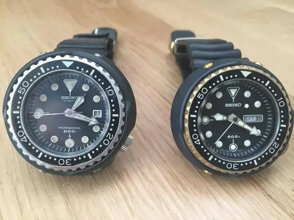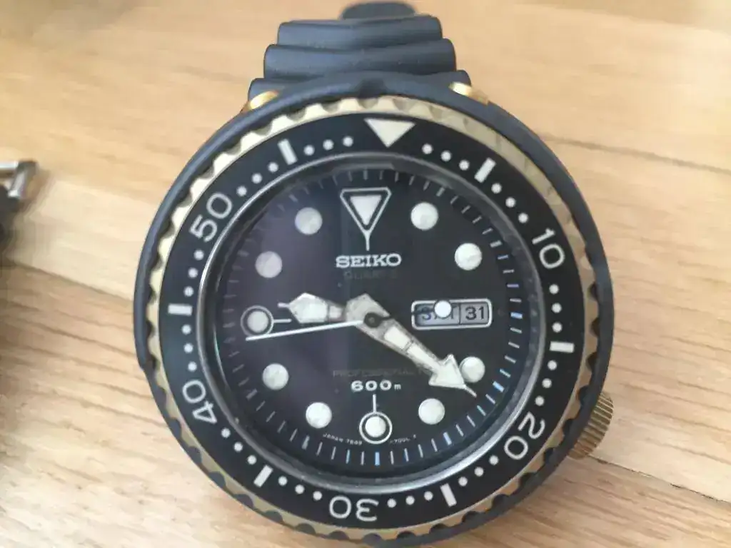 Tras el varapalo de quejas de buzos profesionales por las filtraciones de Helio, y la presencia en el mercado de relojes más extremos (Omega Pro Prof, The Grand, Sandoz Typhoon, Certina DS2 Super PH, Rolex Sea Dweller...) entre 500-1000m, Seiko tiró la casa por la ventana y puso toda la carne en el asador para volver a marcar el nivel más Top entre los diver. Tras años de desarrollo liderados por Ikuo Tokunaga, en 1975 ve la luz el Seiko 6159-7010 "Grandfather Tuna", por su parecido a una lata de atún y ser el primero de una larga serie que aún hoy se comercializa. Este reloj se acompaña de una larga lista de récord e itos en la relojería, como su caja mobloque de 51mm en titanio, empleo de recubrimiento cerámico en zonas de impactos, novedosas juntas en "L", armazón externo atornillado que confiere mayor rigidez, nueva correa de caucho autoadaptable al neopreno, resistencias extremas a magnetismo, aceleración, etc... y todo ello alimentado por el mismo calibre manofactura de alta frecuencia 6159 que se usó en el Professional 6159-7000/1. Este modelo fabricado entre 1975 y 1978 marco el nivel "TOP". Destripado por el especialista que lo ha puesto a punto, aunque para ello su hubo de buscar a un hermano donante : corona, junta, bisel y alguna pieza más del calibre. Aporto las fotos del despeine y de la caja gemela donante: