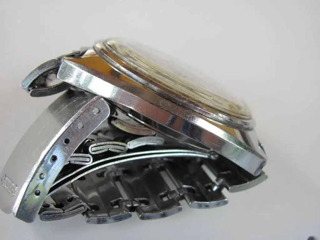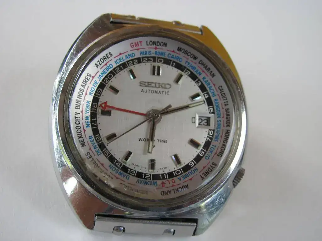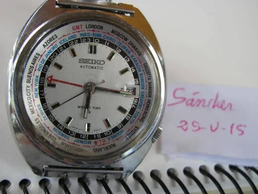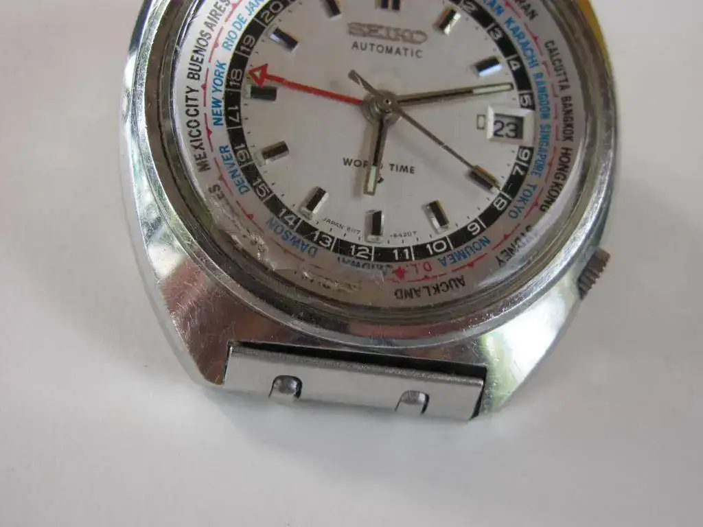Pongo en venta este ejemplar de Seiko 6117-6400 GMT World Time de diciembre de 1969. Movimiento automático 6117B de 17j. Caja de acero de 41mm. Por la fecha creo que es de primera generación y el bisel tiene el "error" de la no coincidencia de horario de Londres y GMT. El reloj se encuentra en un gran estado de conservación con la única tara que el plexy que tiene una raja a las 6 y 7 que le afea un poco. Es todo original de este modelo: esfera, bisel interno, agujas, corona e incluso el armis para muñecas de no mas de 19cm. Su marcha es muy buena así como las demás funciones: cambio de fecha y movimiento del bisel interno. Tiene hecha una revisión este año. El precio es de 260€ con el envío por Correos certificado sin asegurar incluido. Las fotos, como siempre de malas.