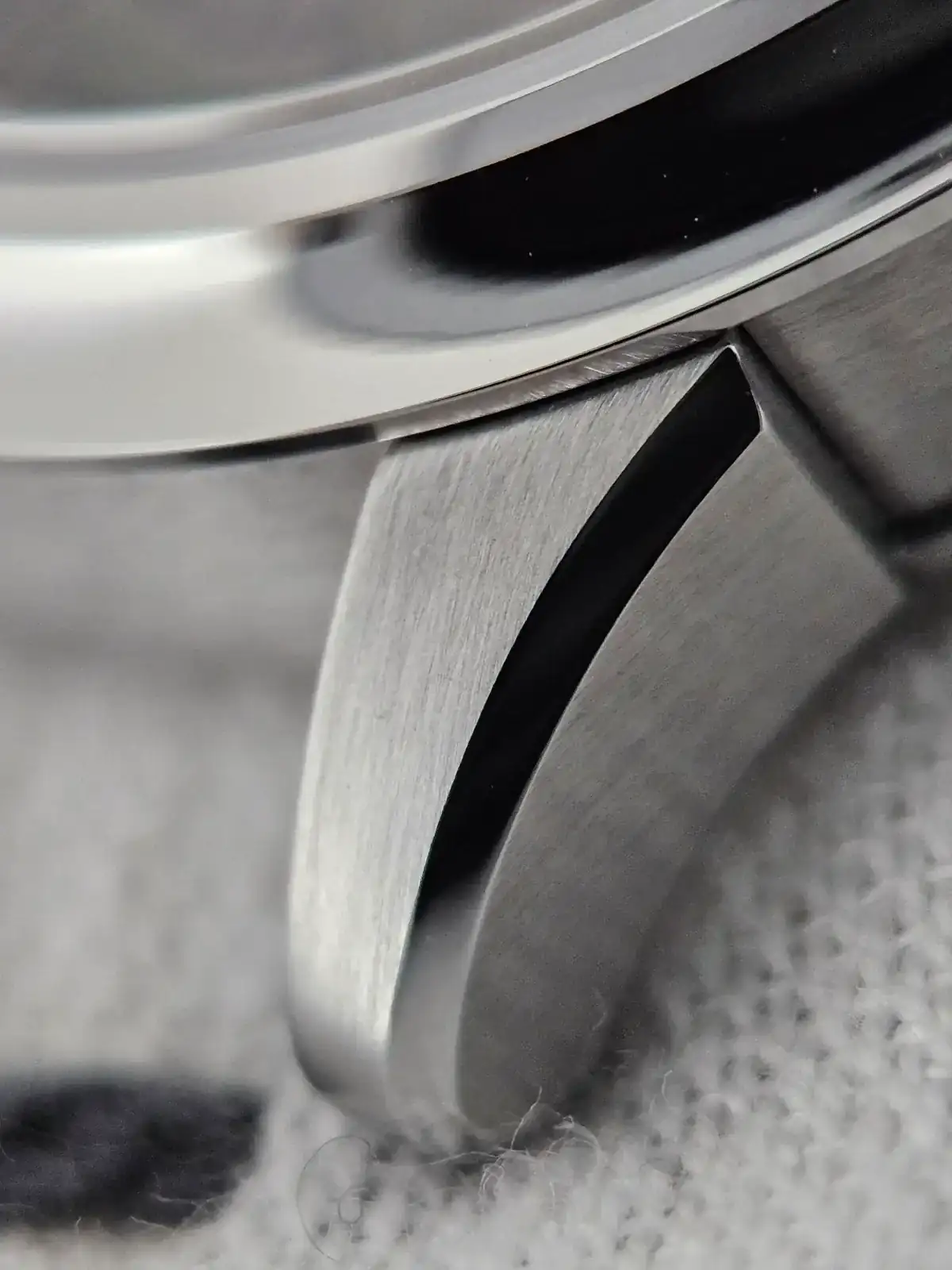 Muestra unos atractivos flancos rebajados, unas asas con las aristas pulidas y un bisel a espejo. Especialmente bonita es la tapa, con una curiosa forma curvada que fluye hacia el exterior, en la foto desde el lado, observaréis que podéis leer los grabados de la tapa. En suma, es un diseño original, cómodo, bonito y muy bien integrado, además de bastante complejo, lo que habla bien de su coste de mecanizado y contribuye a la calidad general percibida