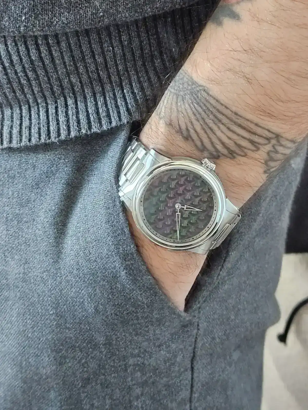 En el caso del Jui, como veremos en detalle en el apartado del dial, es un guilloché CNC sobre madreperla. La fábrica no tiene su propia máquina de CNC, lo cual al parecer es bastante común, sino que para eso tienen un acuerdo con un taller especializado en el CNC. De manera que el dial base "in house", tras pasar por ese taller, vuelve a Selten, donde pasa un estricto control de calidad, y se monta con el resto de componentes.