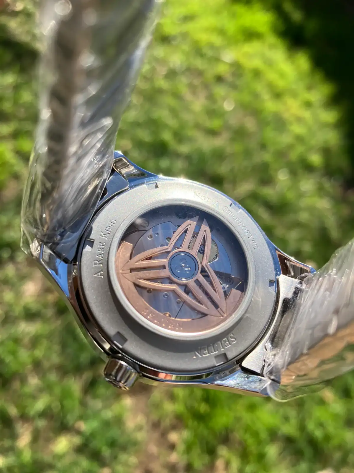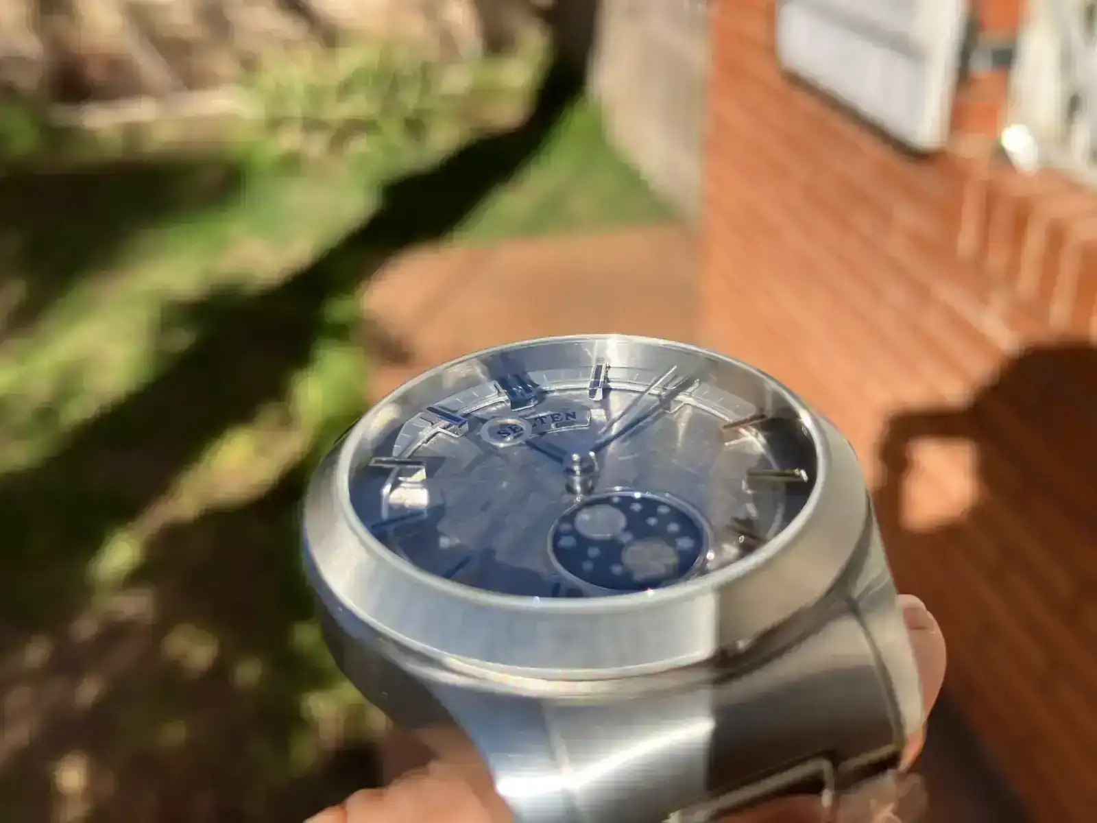 No es un miyota 9 al uso, sino que viene personalizado con un rotor de Selten acabado en côtes de Gèneve con un light play o juego de luces im-presionante. Mira que he visto rotores custom chinos, y luego con la lupa dices, madre mía, si esto está peor rematado que cuando a mi madre le dio por cortar ella misma la tarima flotante con una guillotina de Leroy Merlin. Este rotor, juzgarlo vosotros, pero está realmente precioso, bien terminado, y esto no lo podéis apreciar pero al moverlo se ve increíble.