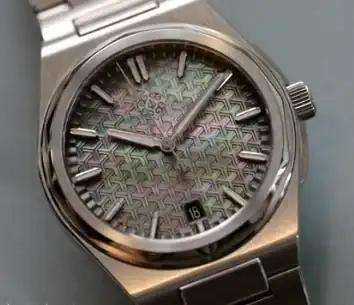 La madreperla tiene un juego bonito según como le incida la luz pero también lo acentúa el guilloché, fijaos que según el ángulo, el patrón se ve más o menos profundo, ya que tiene mucho relieve