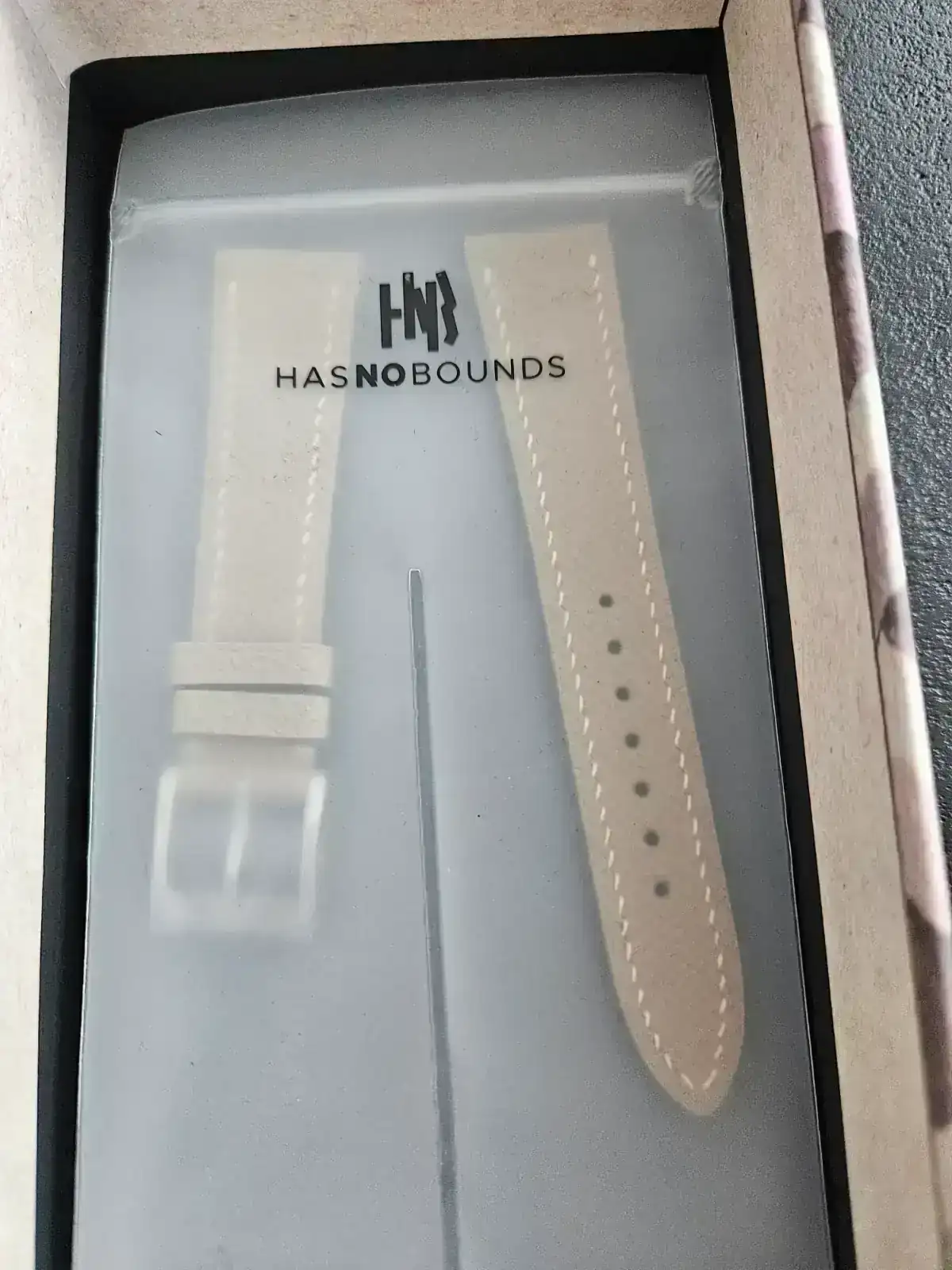 Hagamos como que no lo hemos visto. El reloj viene con dos correas, una es de Has No Bounds, una marca igualmente hongkonesa dedicada a correas de cuero. La correa es bonita y tiene buen tacto, vaya, una correa artesanal como las que pueden hacer los patrios Jacobo, Lorente o Atelier Ferrer. A destacar eso sí, que estos de HNB tienen sus propias hebillas firmadas.