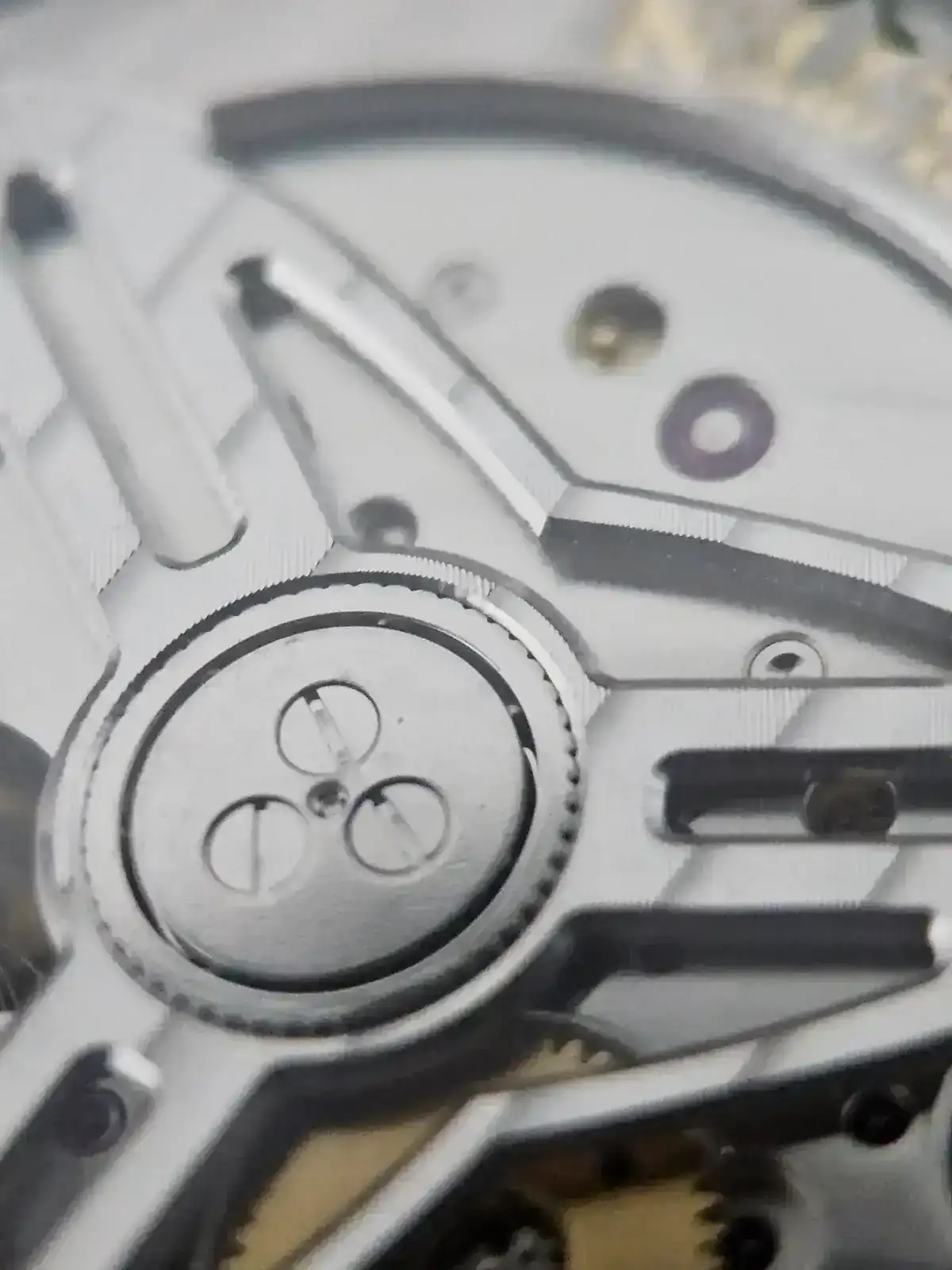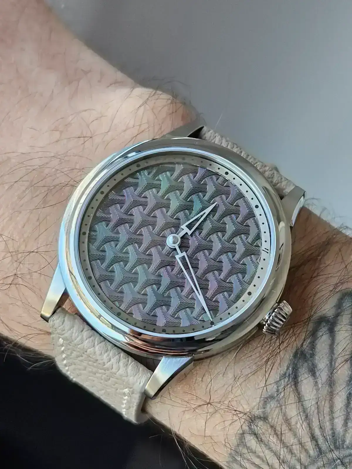 En el caso del Jui, como veremos en detalle en el apartado del dial, es un guilloché CNC sobre madreperla. La fábrica no tiene su propia máquina de CNC, lo cual al parecer es bastante común, sino que para eso tienen un acuerdo con un taller especializado en el CNC. De manera que el dial base "in house", tras pasar por ese taller, vuelve a Selten, donde pasa un estricto control de calidad, y se monta con el resto de componentes.