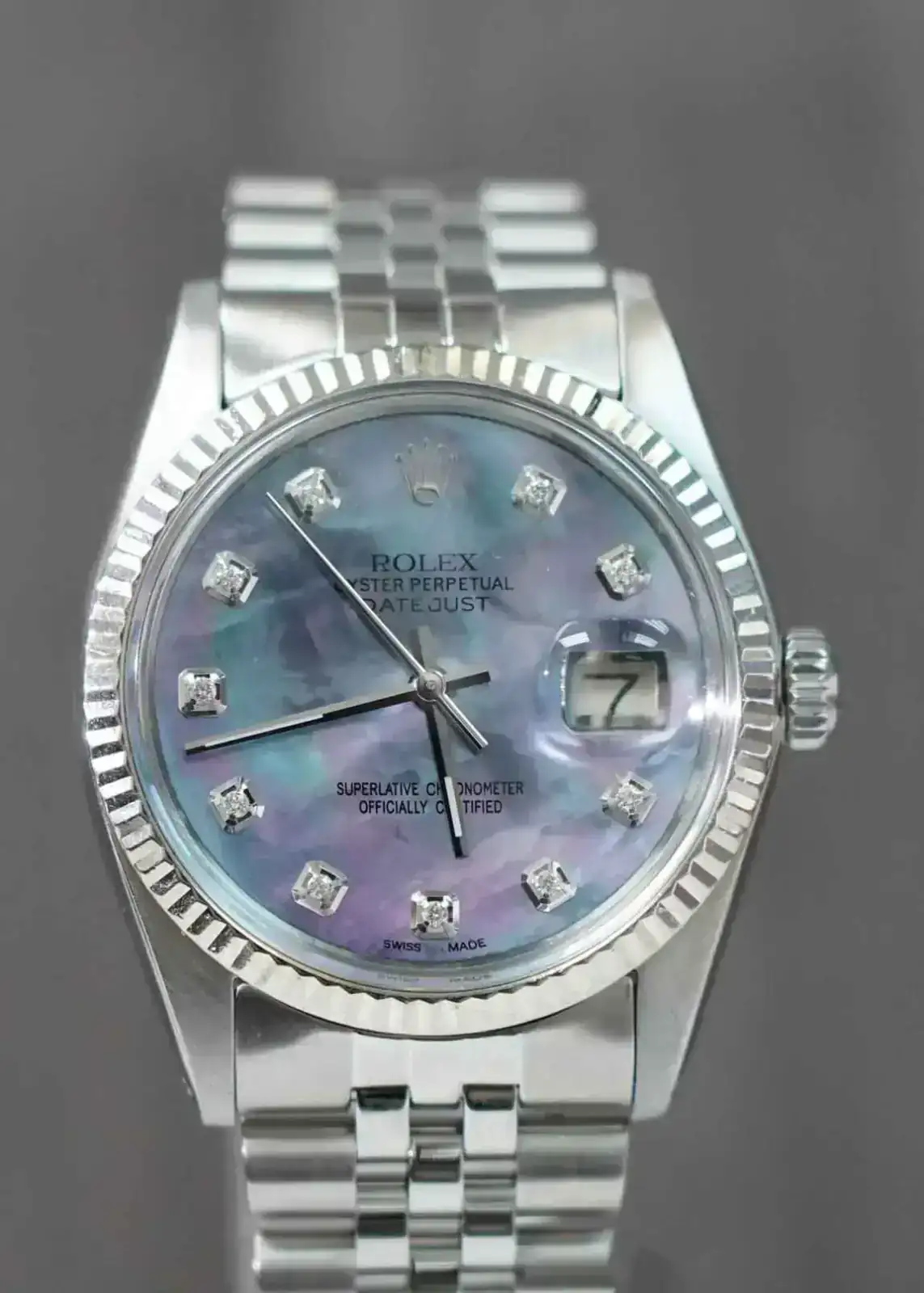 En cuanto al material base, es madreperla negra, o madreperla de Tahiti, en la Polinesia francesa. Es un material cuyo uso en joyería viene de antiguo y en relojería se lo debemos entre otros a pioneros de las esferas curiosas como Rolex. A menudo se dice que si Rolex es aburrido y demás, pero lo cierto es que no se donde estarían las esferas de meteorito, o de piedra, o de madera, de no ser por Rolex. Como ya sabreis el nacar o madreperla sale del interior de las conchas de ciertos moluscos