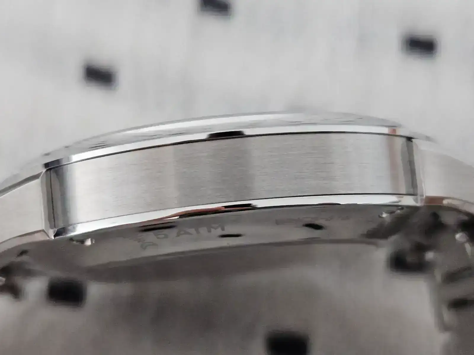 Se trata de un brazalete de eslabones en H que no presenta holgura alguna y que entra en la caja como un guante, agarrándose a ella con unos pasadores de cambio rápido. Ello nos permite alternar con la correa de cuero fácilmente, si bien para sacar este brazalete el obstáculo es lo perfecto que es.