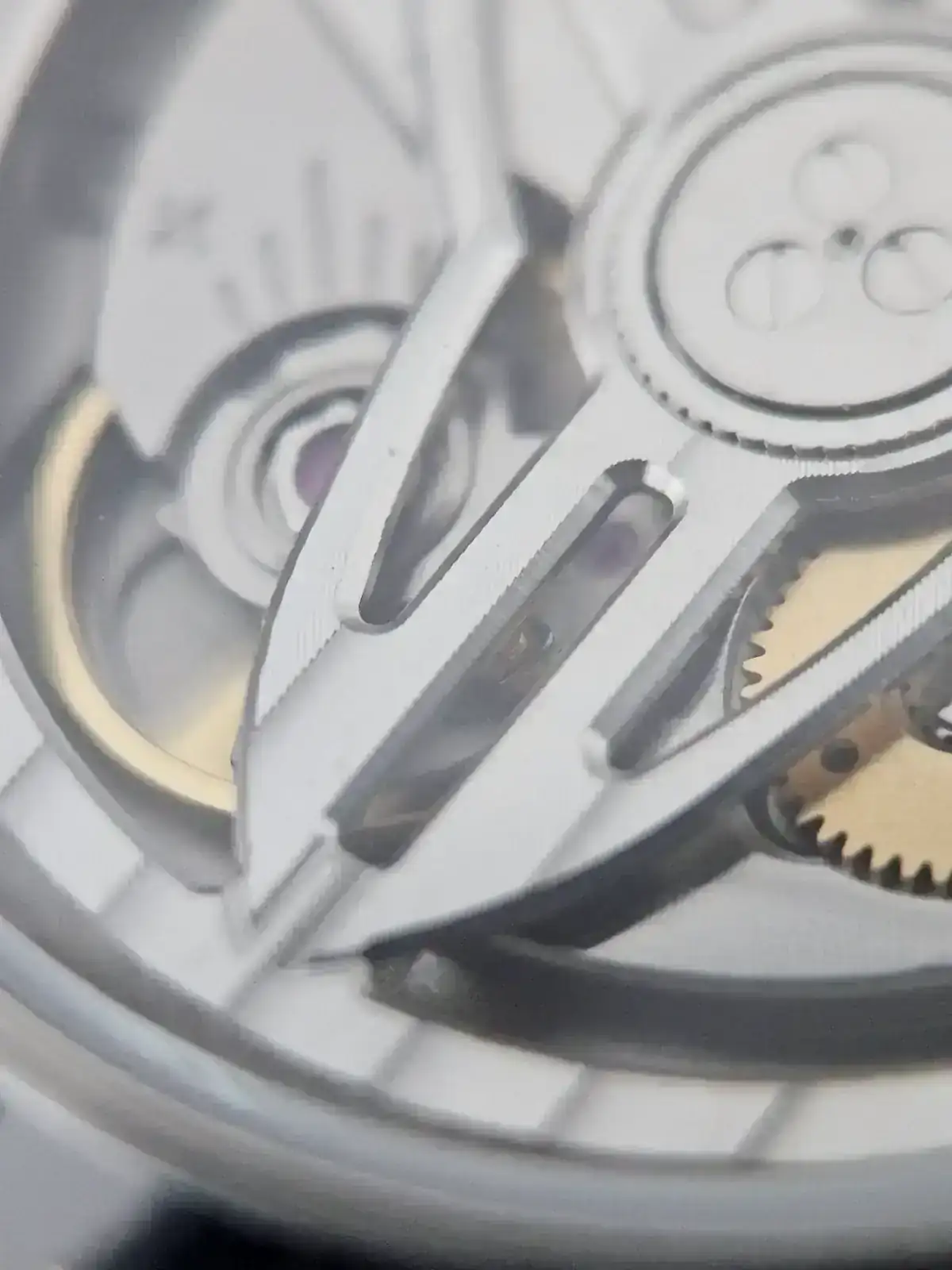 No es un miyota 9 al uso, sino que viene personalizado con un rotor de Selten acabado en côtes de Gèneve con un light play o juego de luces im-presionante. Mira que he visto rotores custom chinos, y luego con la lupa dices, madre mía, si esto está peor rematado que cuando a mi madre le dio por cortar ella misma la tarima flotante con una guillotina de Leroy Merlin. Este rotor, juzgarlo vosotros, pero está realmente precioso, bien terminado, y esto no lo podéis apreciar pero al moverlo se ve increíble.