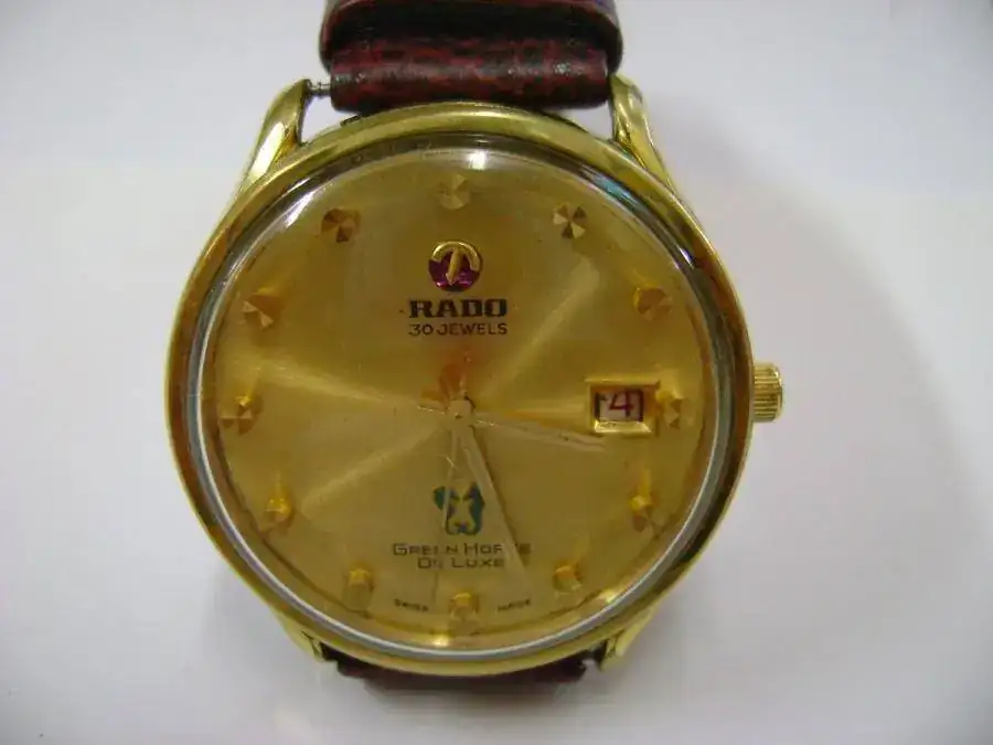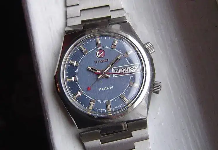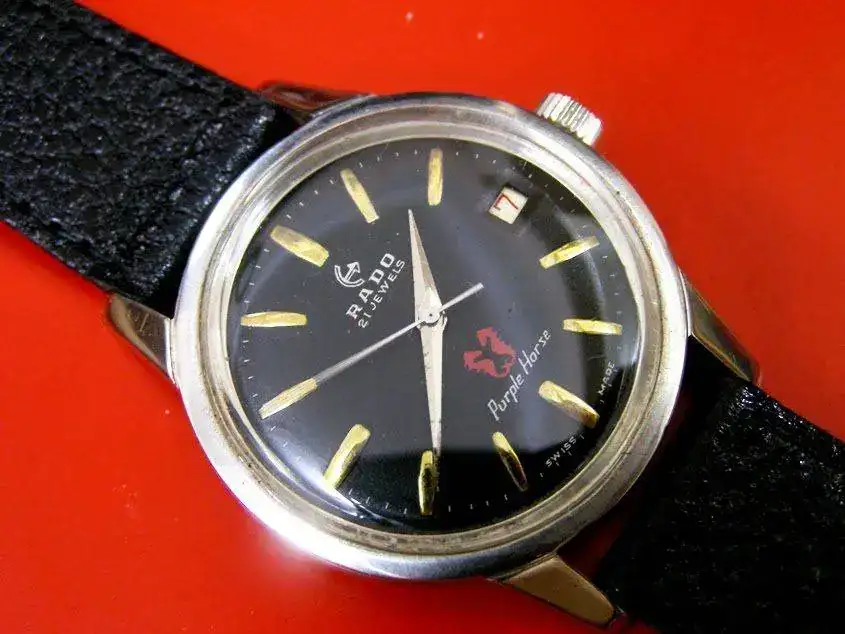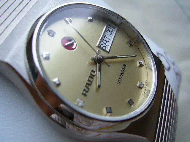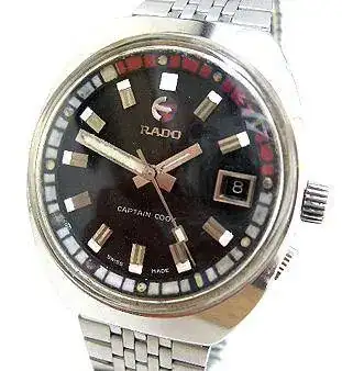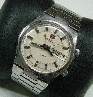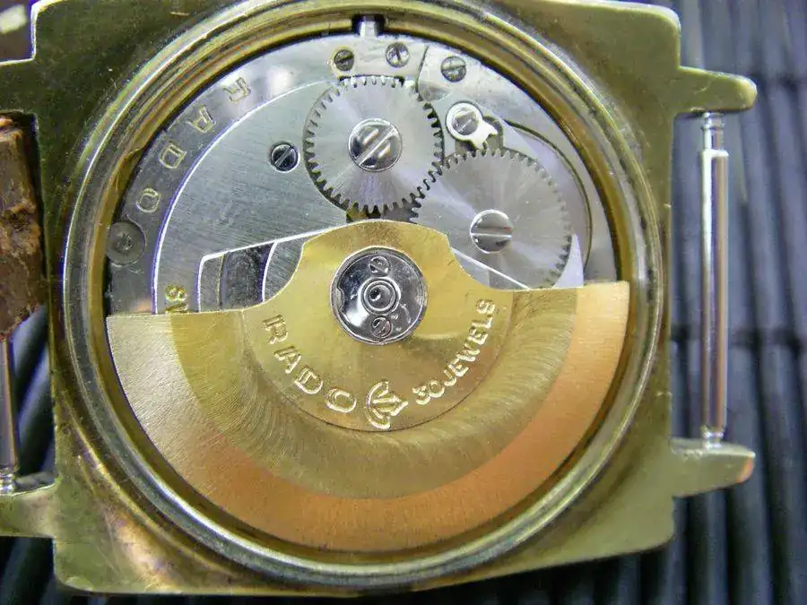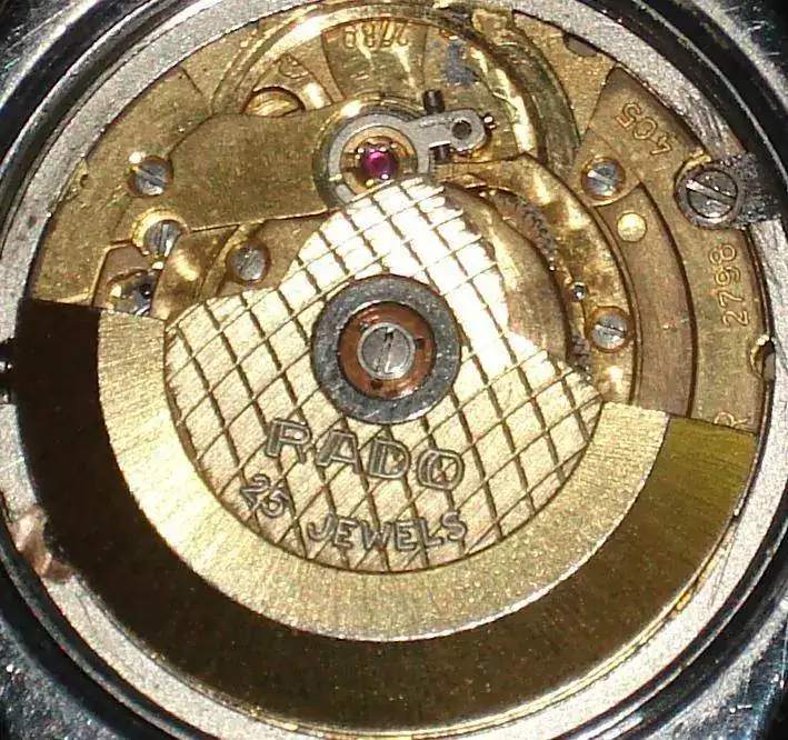 Otra de las caracteristicas de los Rado era el logo de la marca giratorio. Este era un ancla el cual se montaba sobre una especie de rodamiento o rulemán rojo que se encontraba embutido en el dial. El logo giratorio se comenzó a utilizar en los Rado en el año 62, supongo yo que la idea habrá surgido con el Diastar que fue lanzado el mismo año. Luego de ese año todos los relojes de la marca del ancla llevaron el logo sobre este rodamiento que simbolizaba el rotor de un movimiento automático sobre un rodamiento con un rubí. Este no esta conectado a ningúna parte mecánica del movimiento siendo que gira libre según sea sacudido el reloj.