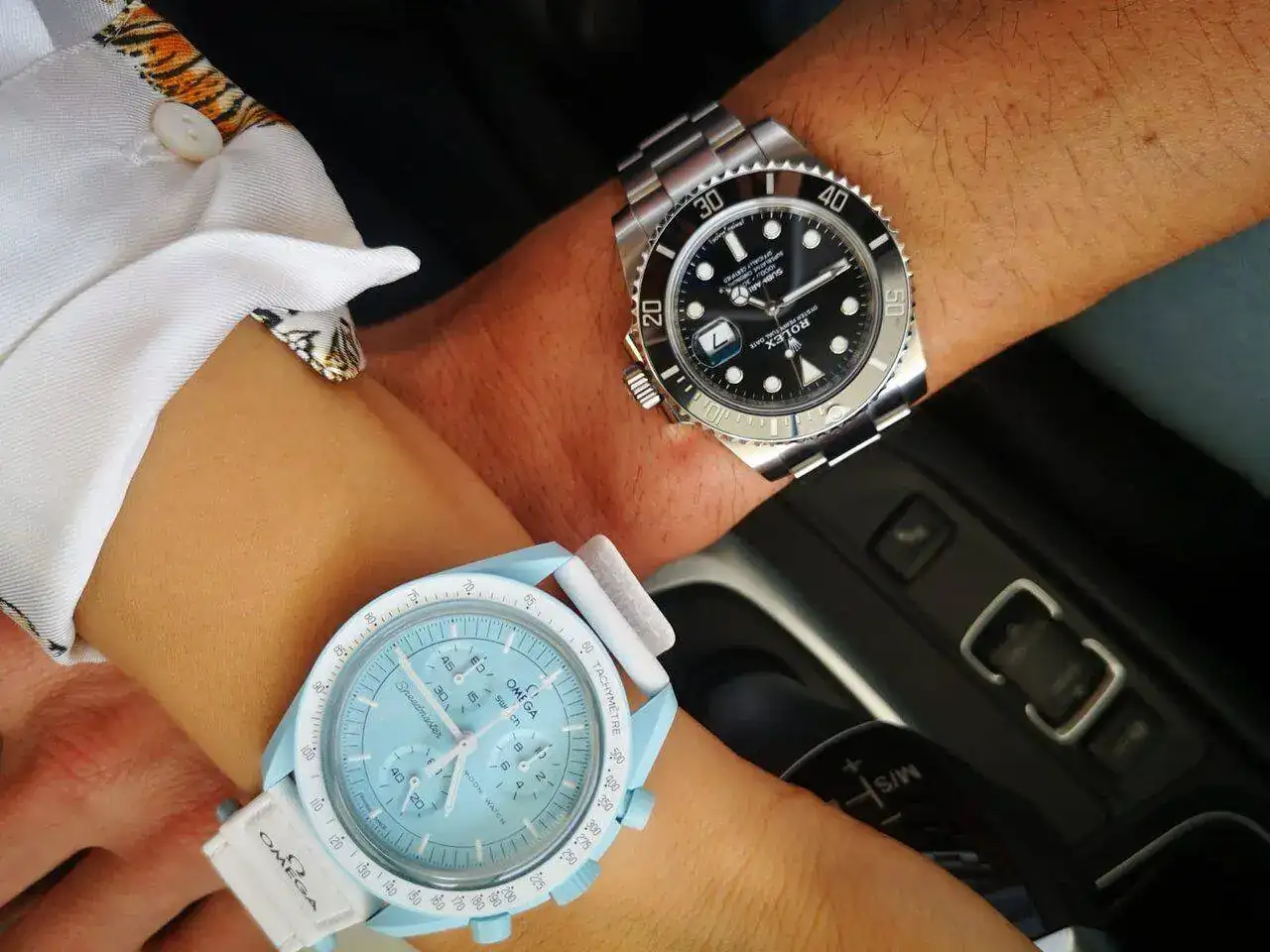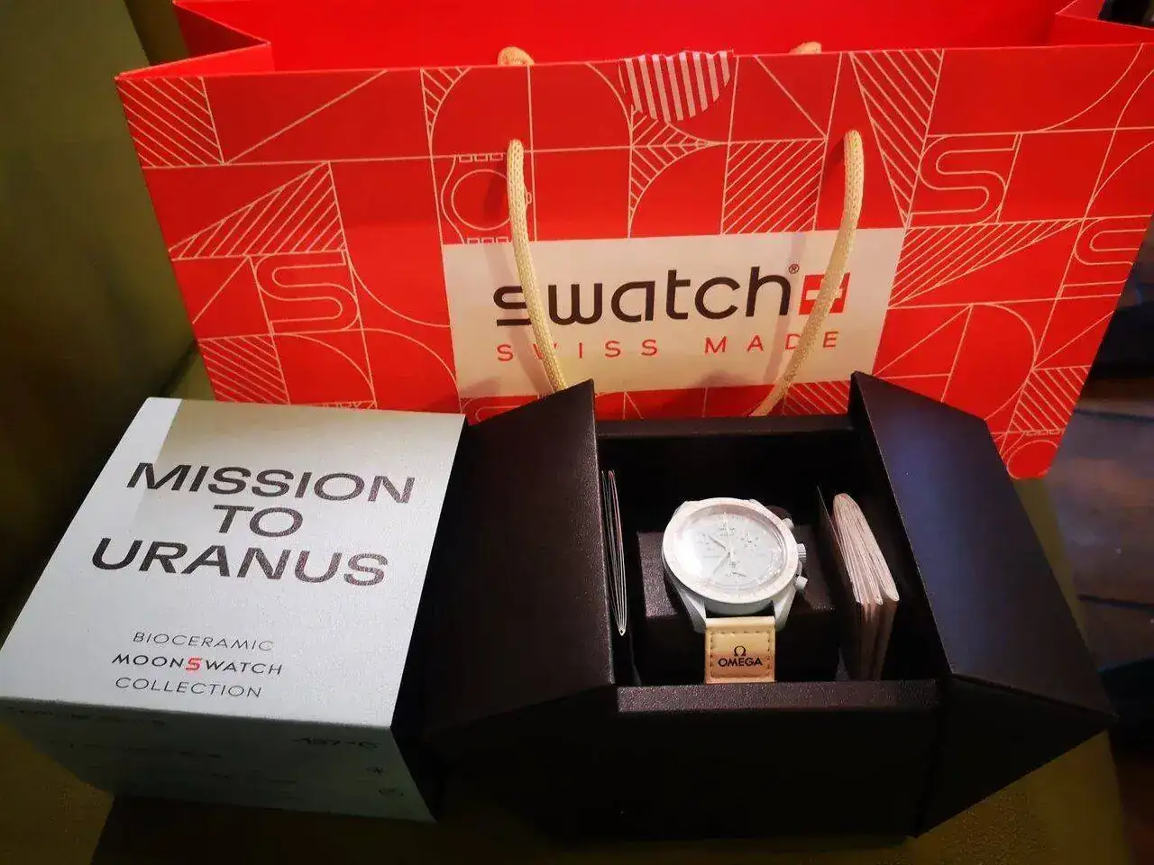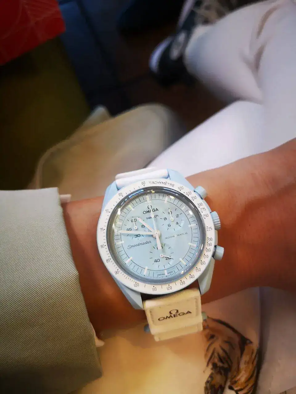 Buenas compañeros, el viernes aprovechando el paso por Gran Vía en Bilbao por la mañana y justo coincidiendo con la apertura de la tienda Swatch, le sugerí a mi MDD entrar a ver si le gustaba algún reloj de plástico de moda, perdón Biocerámica. Pues bien, pregunto por el reloj de su marca más demandado actualmente, me dicen que tienen existencias de los colores rojo, azul claro, el amarillo y el rosa, los demás están más demandados y llegan a cuentagotas, o eso dicen. Después de echarles un vistazo, la MDD decide quedarse con el Urano ( azul claro). Se lo regalo, se lo pone y sale muy contenta con su nuevo juguete, yo más contento que ella porque consigo estimular su interés por la relojería, y por el Speedmaster "pata negra". Seguidamente vamos a echar un café con su un pincho de tortilla con y sin cebolla, y aprovecho para probármelo. La verdad que estéticamente están muy conseguidos, la sensación en la mano es la que es, un reloj de plástico, que pesa como otro plástico, pero es bonito casi como un Omega el jodido, y eso que en esta versión no es tan parecido al original por la tonalidad.