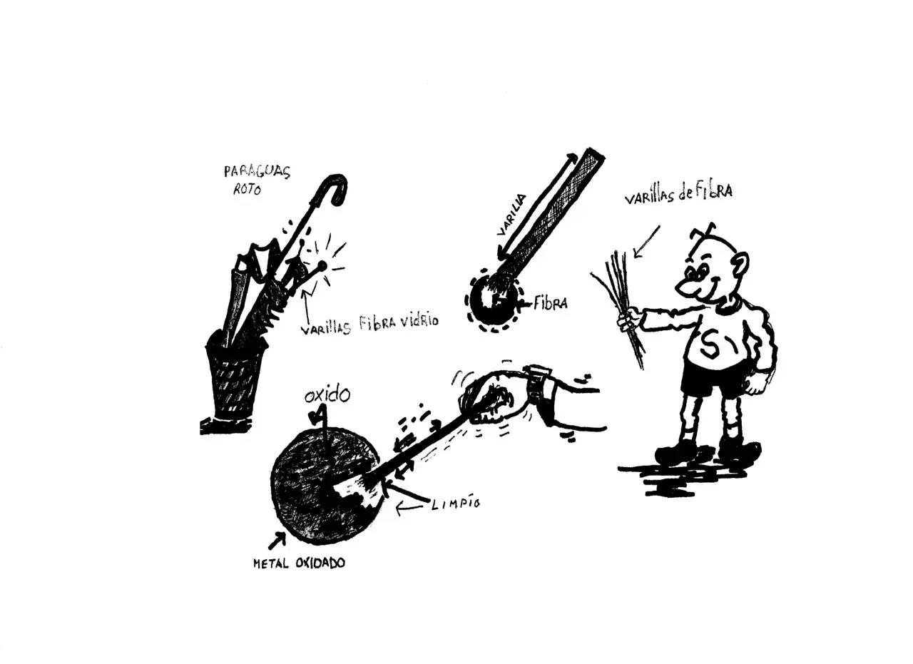 Desmotamos el paraguas, retirándole las varillas de fibra de vidrio, no de acero, las que cortaremos a trozos de unos 20 cm de largo, con ayuda de una mola, y protegidos con gafas y mascarilla, sacamos punta, a la varilla de paraguas, de fibra de vidrio, como si lápiz fuera. Seguidamente la apoyamos sobre un mártir (tas de acero) y picamos sobre la punta, con martillo, deshilachando las fibras de vidrio, de forma que nos quede un pincel.