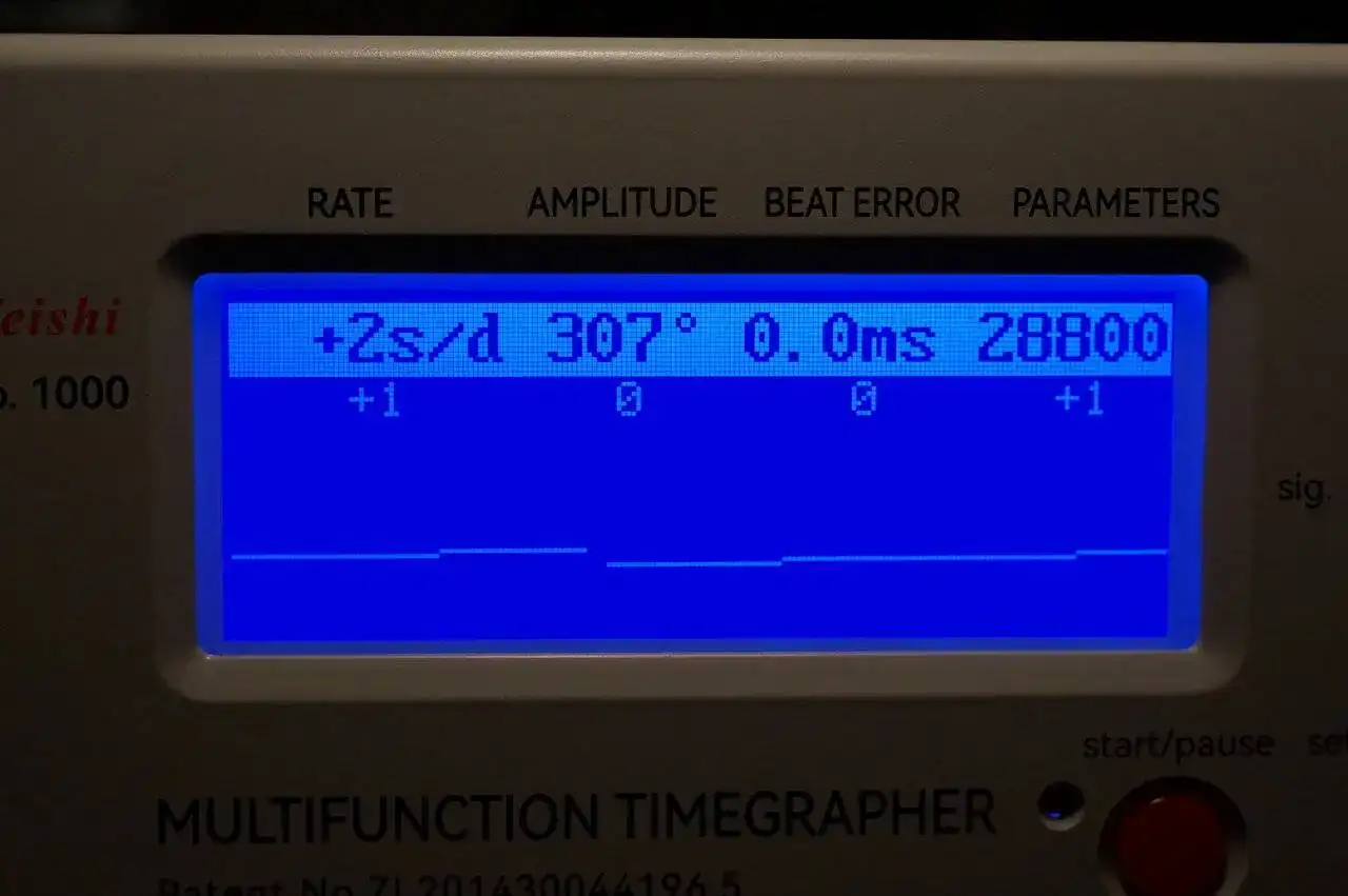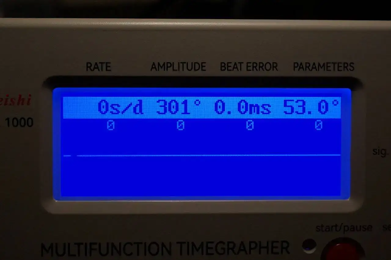 6: Las fotos del timegrapher son los resultados tras dos ciclos enteros de carga, y 90 minutos tras dar cuerda al 100%. Son la sposiciones horizontales. Estoy contento porque aprobé el examen: La poca variación indica que hice un buen trabajo y que el calibre tiene buena salud.
