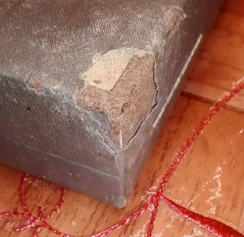 El set, cuando llega, da miedo. La caja, de metal y lo que parece ser cartón prensado. viene con un fuerte olor a tierra húmeda. No a humedad o moho. A tierra húmeda. Presenta los desperfectos típicos que provoca el hambre a los roedores que se han comido parte del tapizado de la caja (si, son mordiscos de rata) y, por supuesto, el hierro completamente oxidado ( a eso no le pudieron hincar el diente).