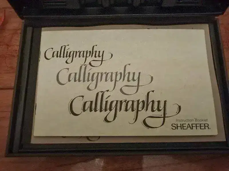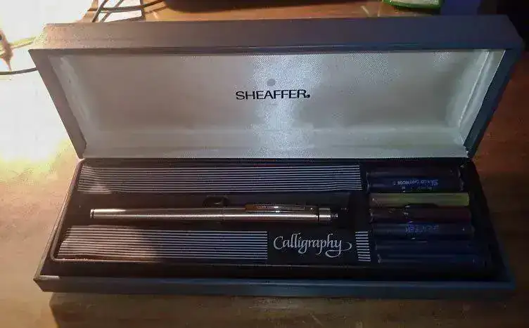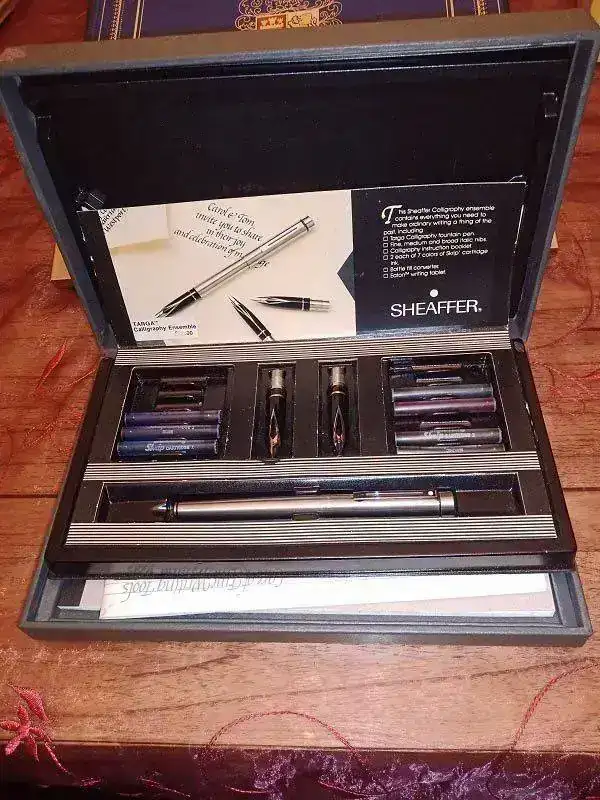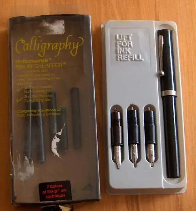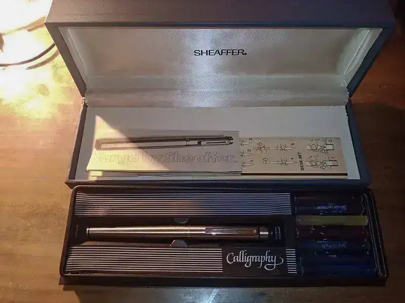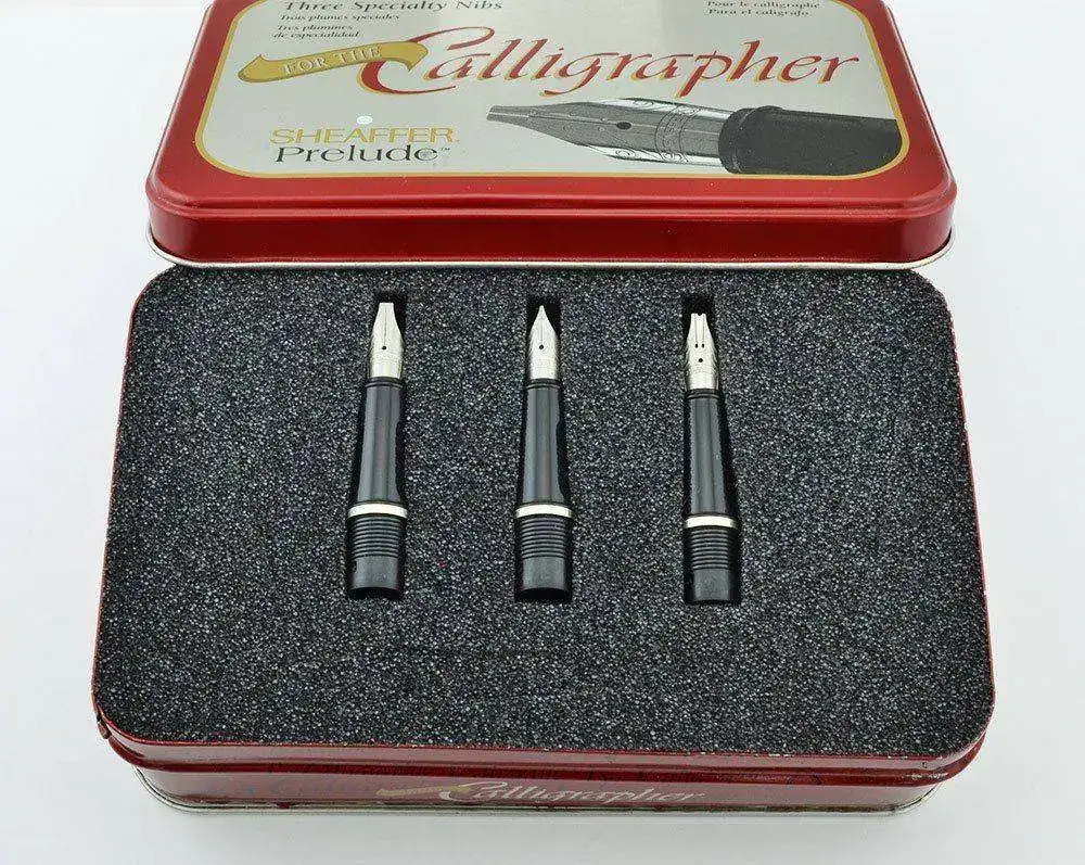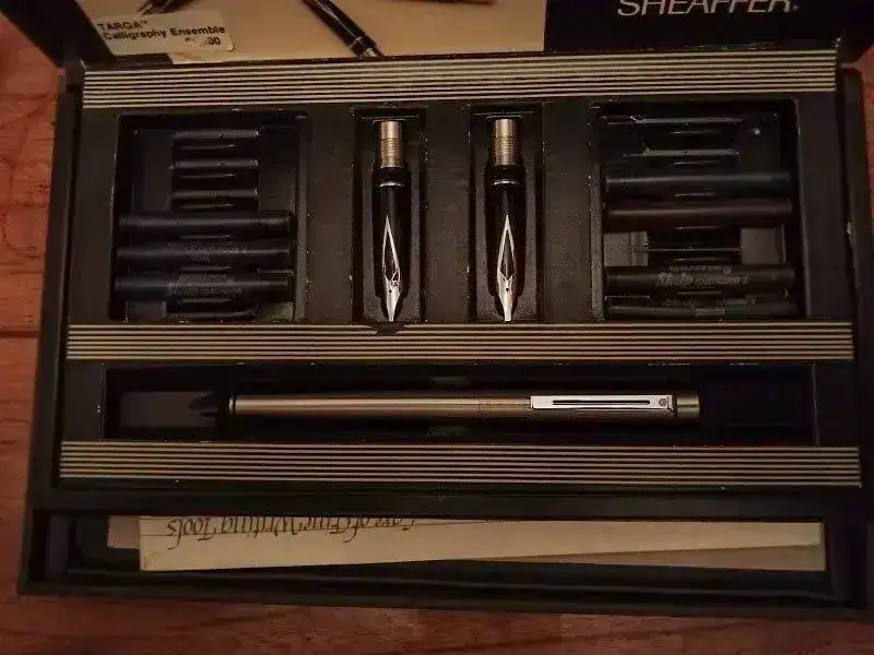 Hace unos años, un amigo que conoce bien mi gusto por los plumines "rarunos" me puso en conocimiento sobre estos sets caligráficos de Sheaffer y poco después me hice con el primero, el de una sola pieza que pueden ver más abajo. Fue en ebay. Se lo compré por unos 35 euros a un germano. Desde entonces se quedó como la única pluma con plumín de acero de mi colección.