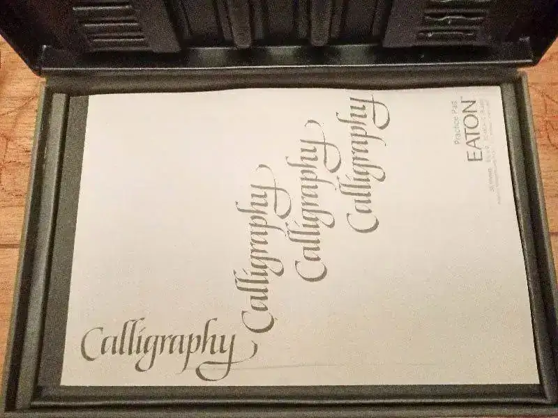 Levantando la bandeja de plástico que sujeta pluma, plumines y cartuchos, nos encontramos con el librito que pretende enseñarnos a escribir bonito mediante una serie de ejercicios y consejos. Pero debajo de este (esto es lo que más gracia me ha hecho) encontramos un cuaderno para la práctica que está por estrenar. Ni una sola hoja ha sido escrita.