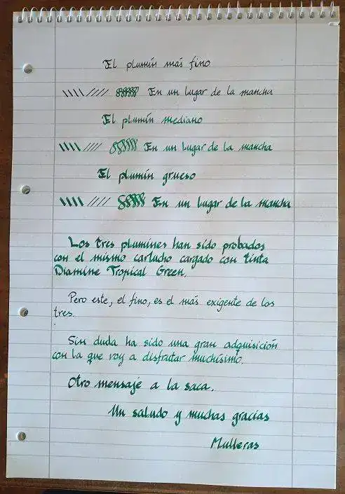 Seguiré mi peculiar carrera hacia el número de mensajes necesarios para vender mis tinteros sobrantes mostrando esta, mi última adquisición. Para ello escribo el borrador de este mensaje con la propia pluma mostrada, cargada con Diamine tropical Green, que me regaló un amigo, en papel Expertiz comprado en el supermercado Aldi. El plumín elegido es el que llevaba el set por defecto, siendo el de trazo más fino.