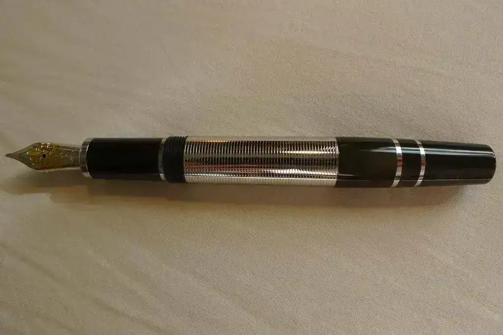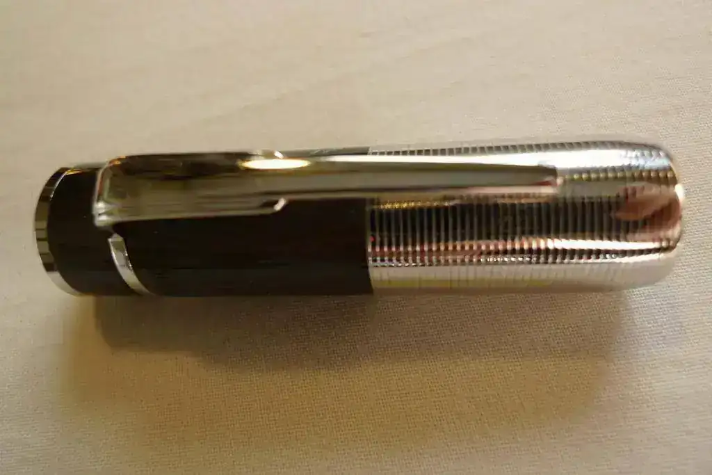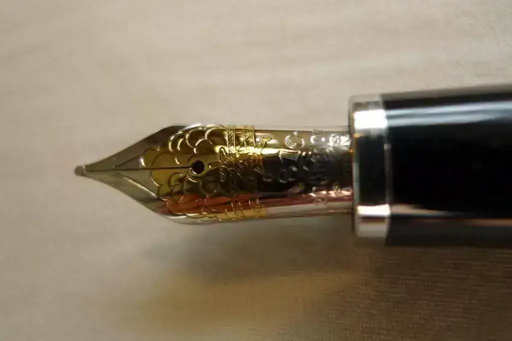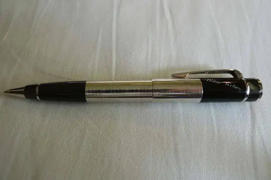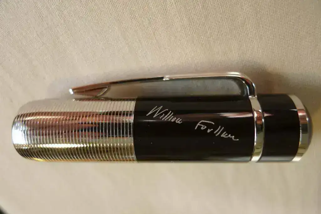 El plumín de la estilográfica es de oro de 18kt. en plaqué platino, hecho a mano, grabado con el biplano de Faulkner (el escritor participó como aviador en la I Guerra Mundial). La carga de tinta es por émbolo integrado en el cuerpo. El plumín de la unidad de este set es M.