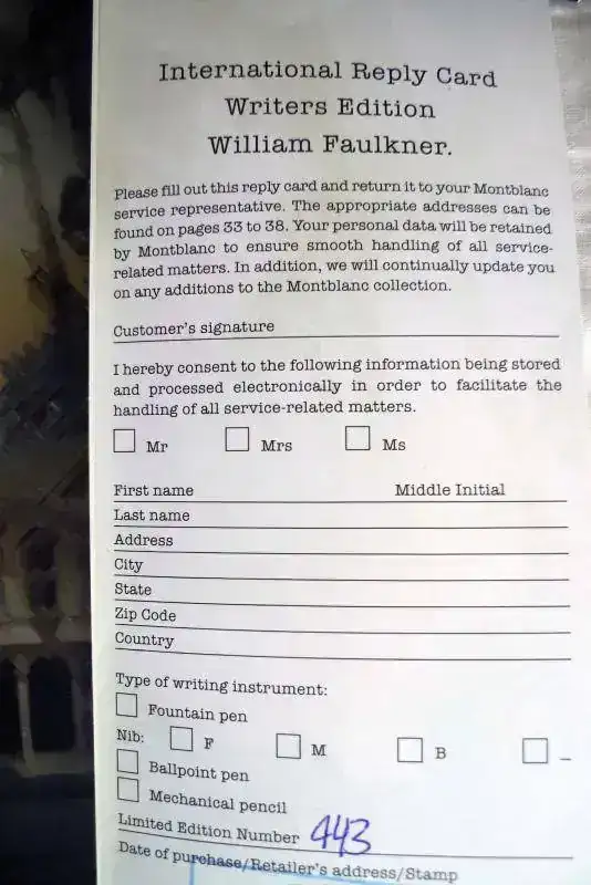Vendo este set de coleccionista William Faulkner de Montblanc, perteneciente a la serie que se inspira en grandes escritores de la literatura universal. Montblanc dedicó la edición de 2007 al que fuera Nobel en 1949, y Pulitzer en dos ocasiones.