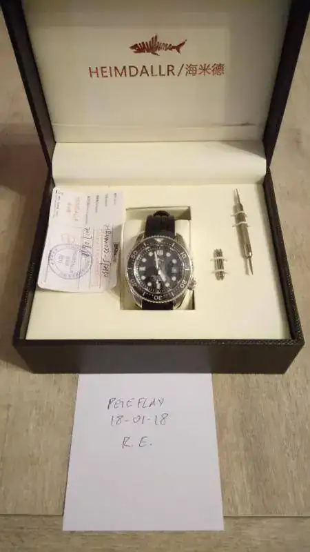 Lo envío con toda su dotación, caja exterior de cartón, estuche, herramienta para quitar la correa, dos pasadores extra y la tarjeta de garantía (está comprado en agosto del año pasado). Decir que las fotos son las de su antiguo propietario, que me comentó que lo había usado en contadas ocasiones. La única foto mía es la del papelito con el nick y la fecha, y como podéis ver el reloj aún lleva el plástico con el que me llegó, no me lo he puesto ni una sola vez, está igual que lo recibí. En conclusión, es un reloj ideal para quien quiere tener un reloj de estética similar al MM300, pero mucho más asequible.