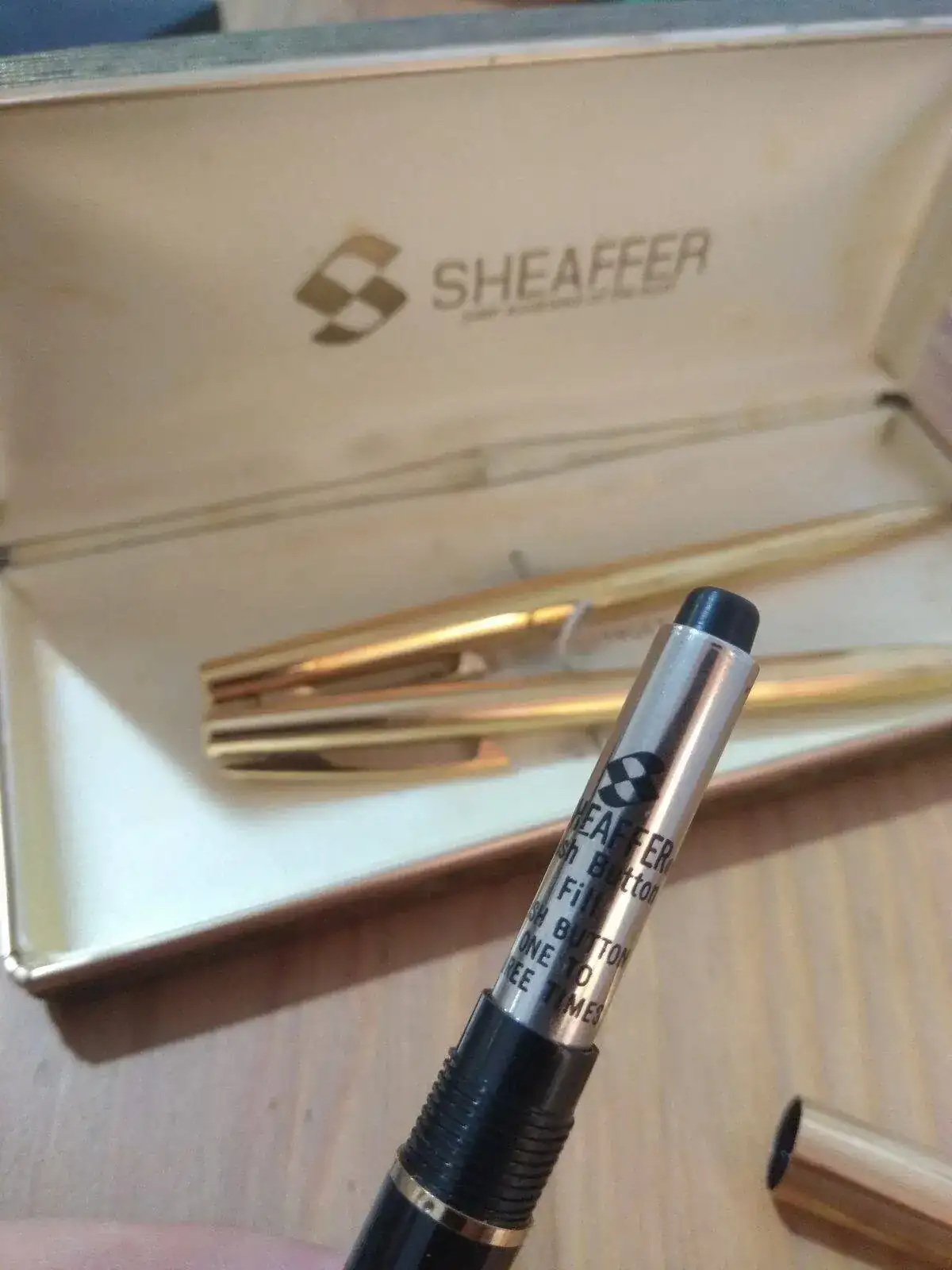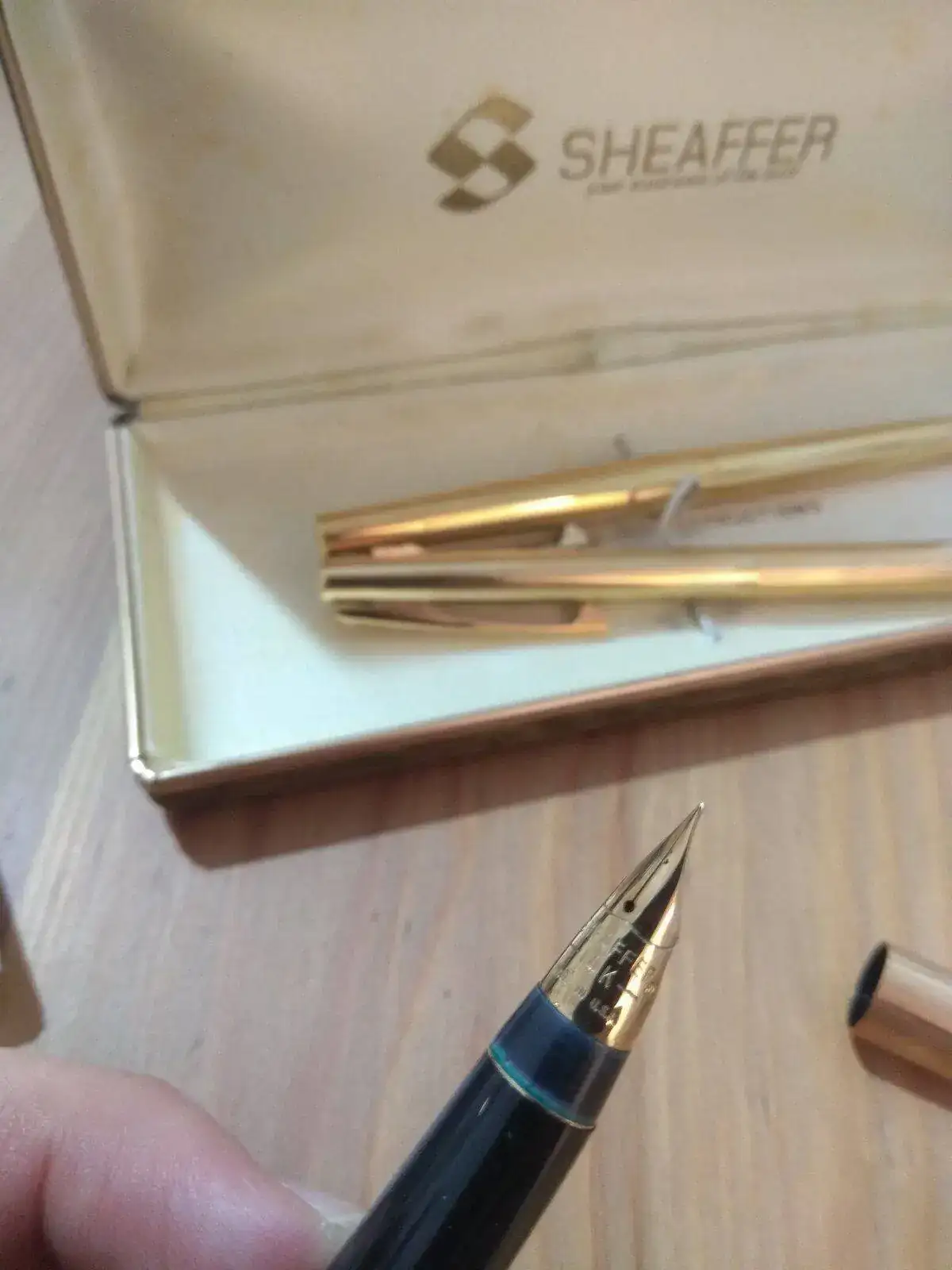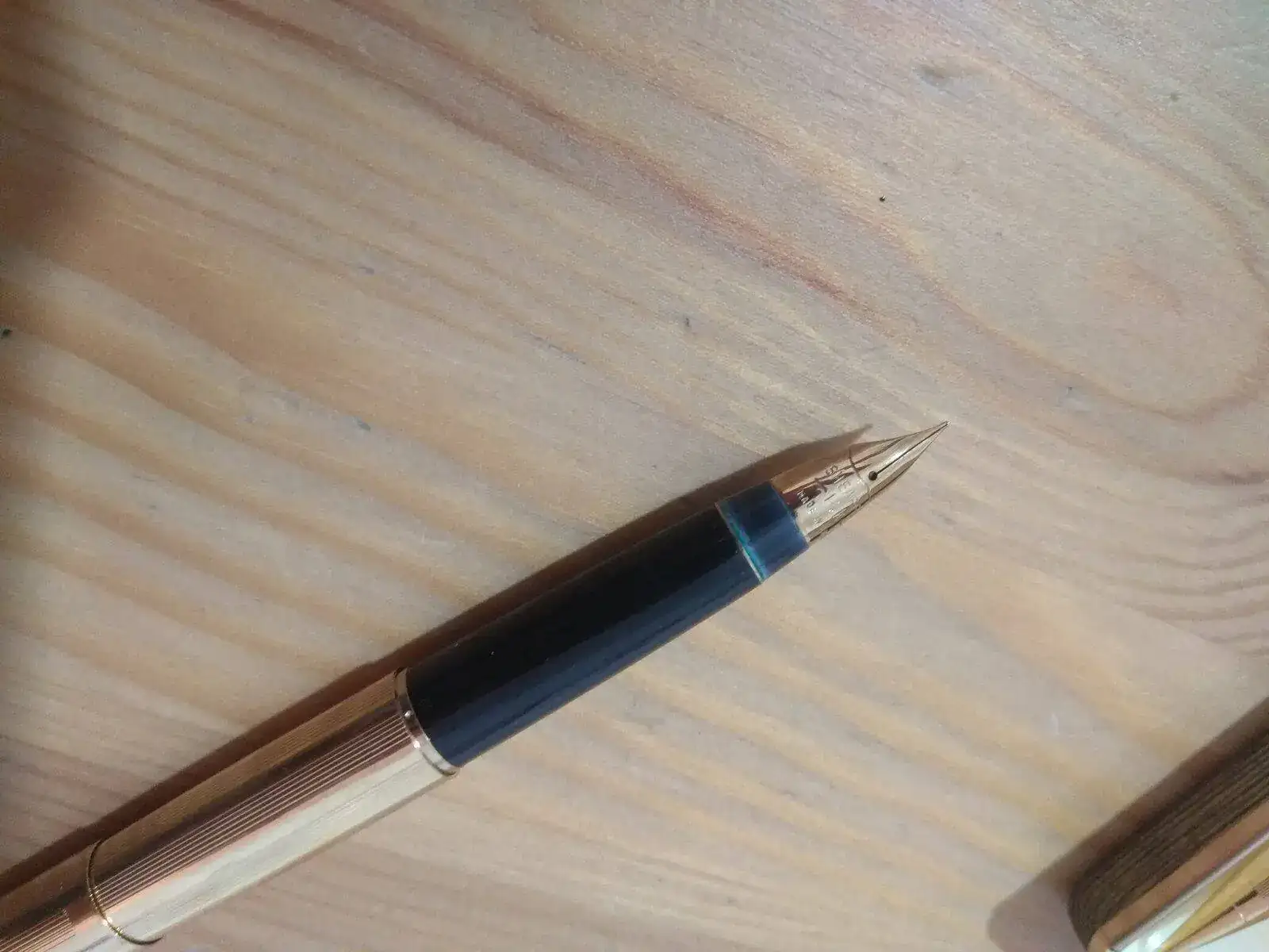 Se trata de la Sheaffer 727 con plumín Triumph de oro de 14k. Su punto de escritura es sutilmente fino, sin llegar a ser un alfiler y su comportamiento es noble y muy suave. A pesar de tener el cuerpo de metal es una pluma muy cómoda y equilibrada, nada pesada. Una pluma maratoniana para pasar muchas horas escribiendo con ella. ¡Y eso sin hacerle ningún tipo de modificación al plumín! Claro que tampoco se presta a ello dado su tamaño.