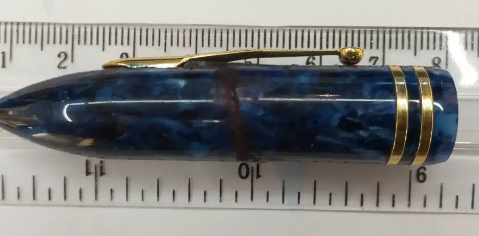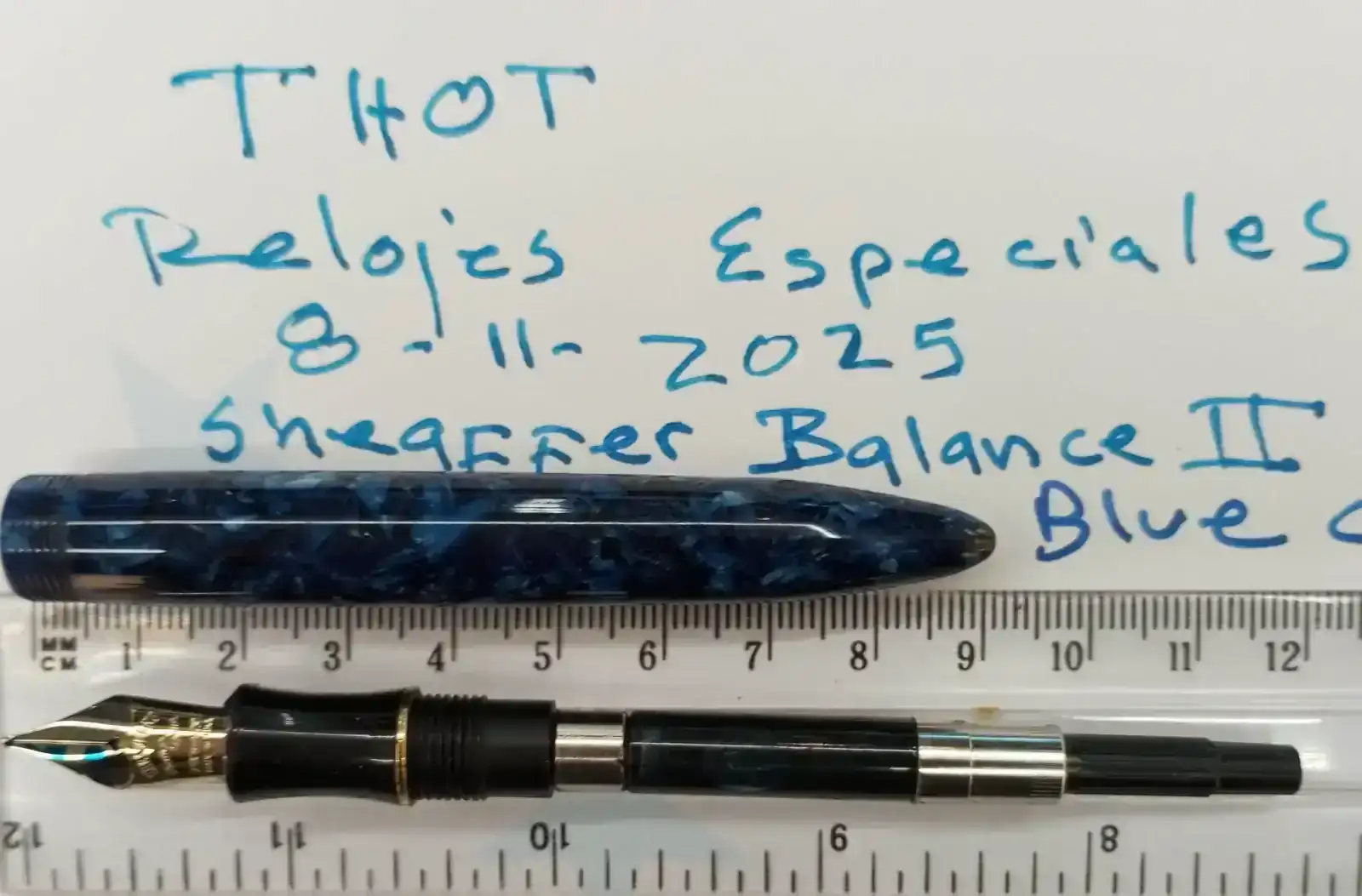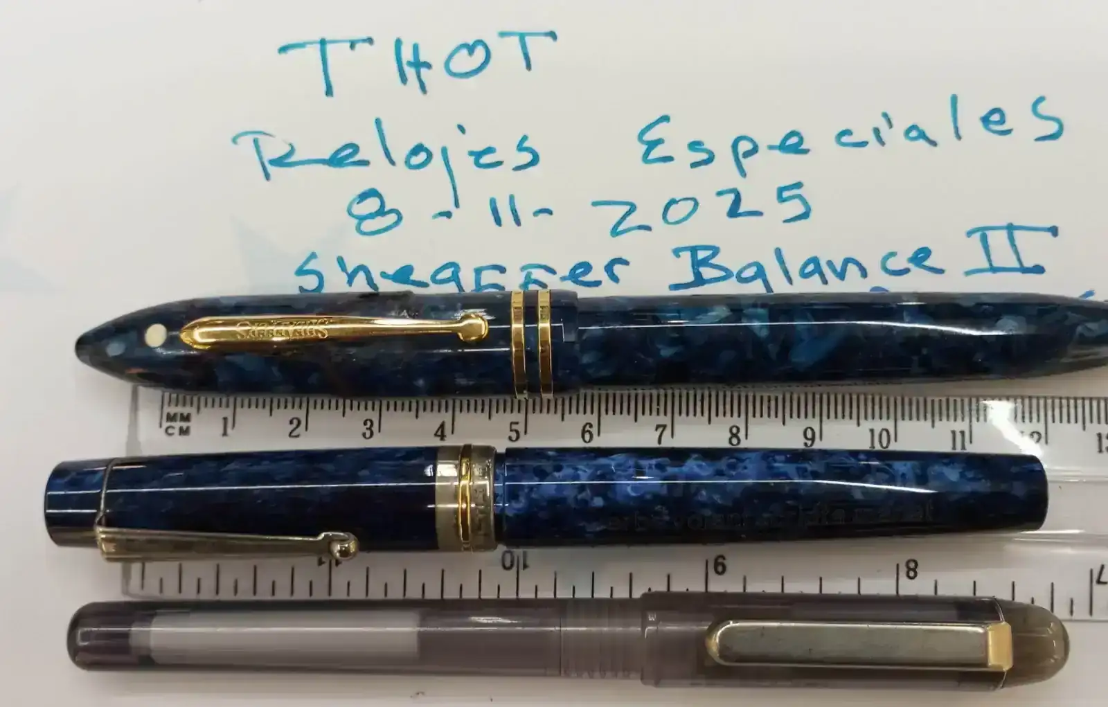 La primera es una Sheaffer Balance 2, con plumín ancho y en color azul cobalto. Esta pluma pertenece a las ultimas series que se fabricaron en Wisconsin. Algunas de ellas, como es la que vendo, sufrieron una fatiga del material con el paso del tiempo y "literalmente" se craquelaron. Este hecho puede comprobarse en las foto de l capuchon. Mi mujer, que había hecho un curso de restauración japonés, la arreglo mantenido visible la huella de la fractura. En esta pluma, lo único afectado fue el capuchón. El plumín es ancho, modelo feather de Sheaffer. Escribe bien y mantiene el flujo. El convertidor/cargador es práctico y con una buena capacidad, como se puede ver en la foto.