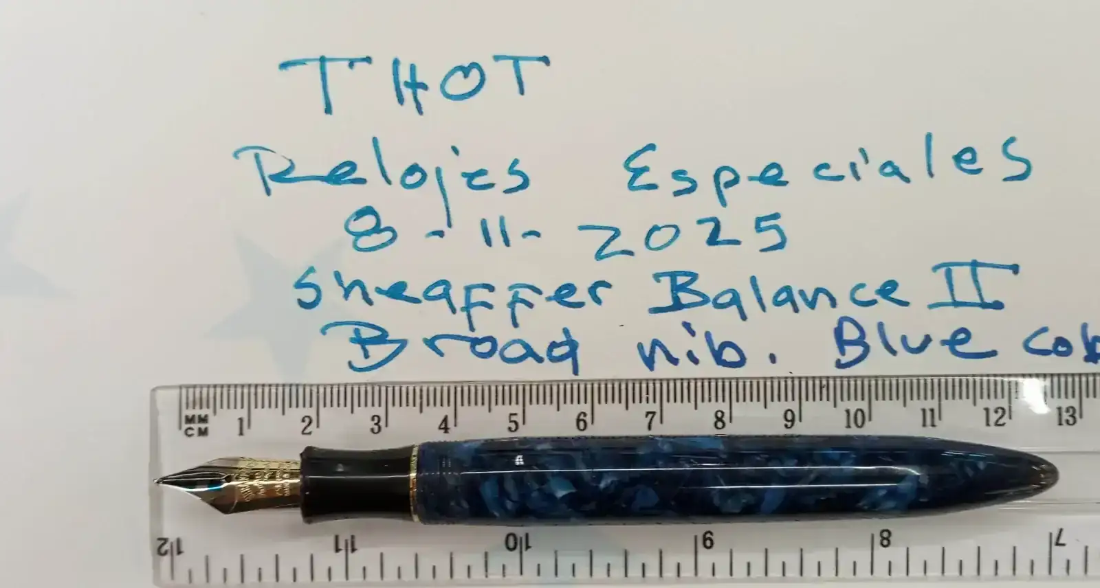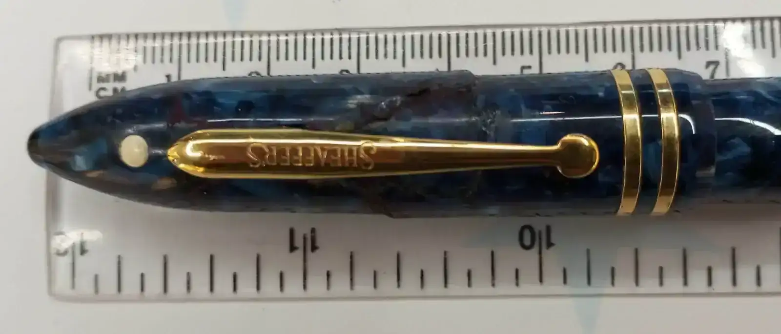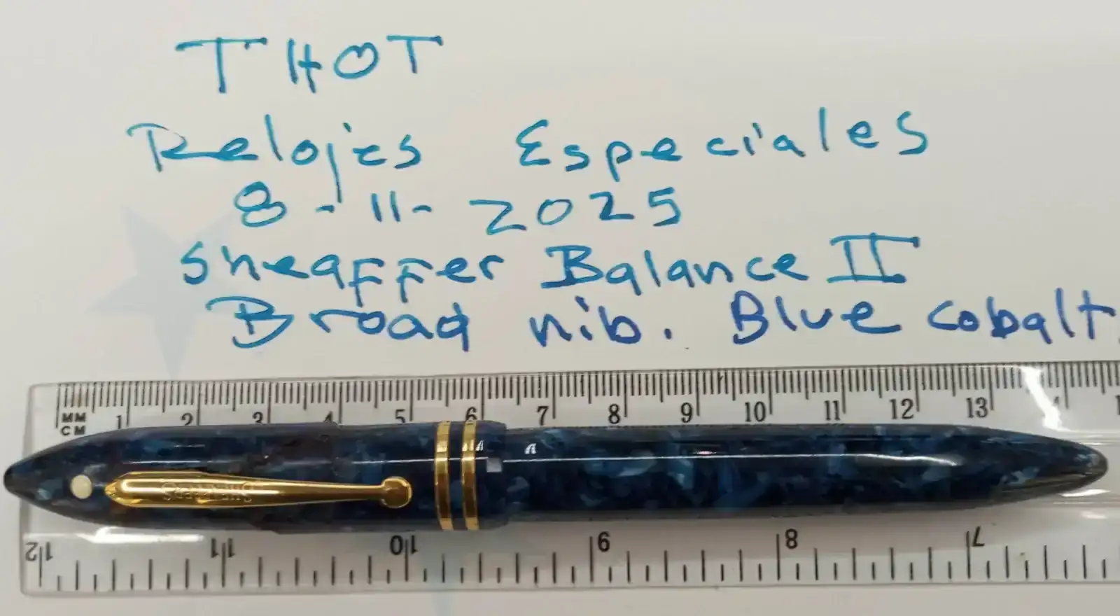 La primera es una Sheaffer Balance 2, con plumín ancho y en color azul cobalto. Esta pluma pertenece a las ultimas series que se fabricaron en Wisconsin. Algunas de ellas, como es la que vendo, sufrieron una fatiga del material con el paso del tiempo y "literalmente" se craquelaron. Este hecho puede comprobarse en las foto de l capuchon. Mi mujer, que había hecho un curso de restauración japonés, la arreglo mantenido visible la huella de la fractura. En esta pluma, lo único afectado fue el capuchón. El plumín es ancho, modelo feather de Sheaffer. Escribe bien y mantiene el flujo. El convertidor/cargador es práctico y con una buena capacidad, como se puede ver en la foto.
