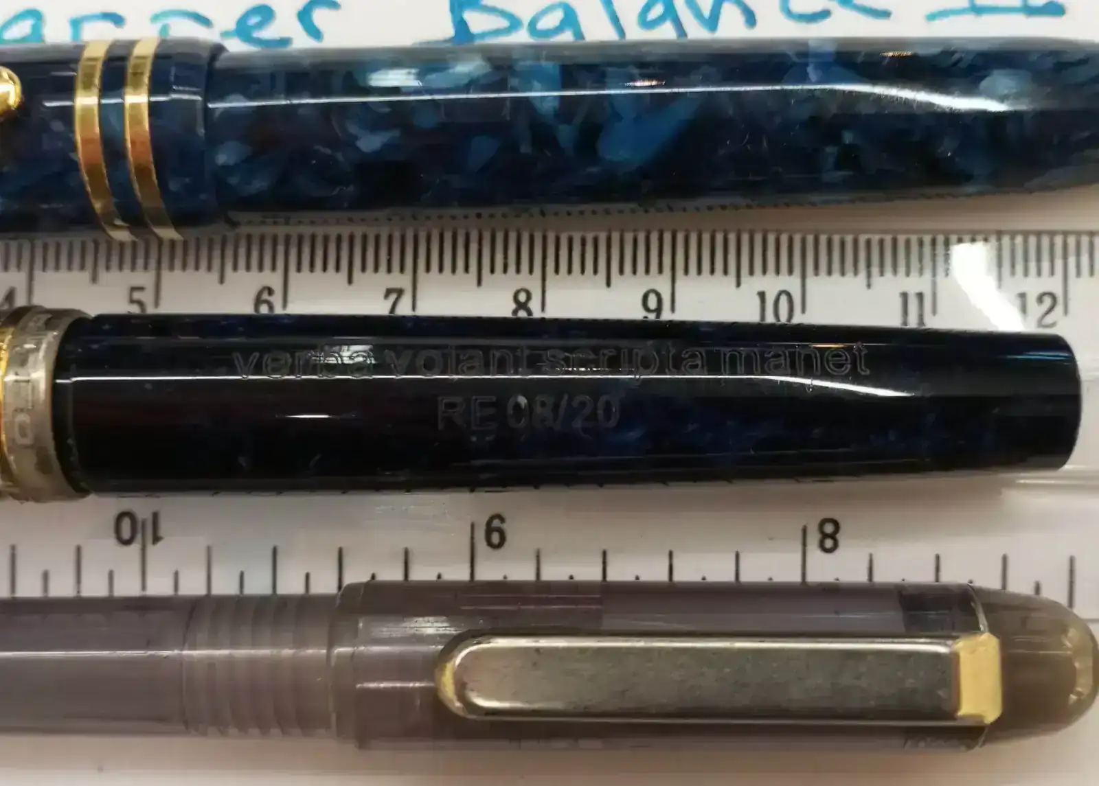 La segunda pluma es Delta vintage, plumín fino y viene con su cartucho. No tengo el cargador. La use bastante y está en excelentes condiciones. Es la numero 8 de 20 y tiene una inscripcion latina en el cuerpo: "verba volant script manet". Color azul y el clip clásico asi como el plumín de delta en acero.