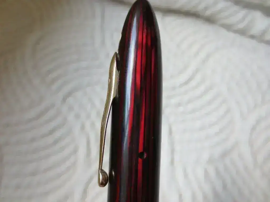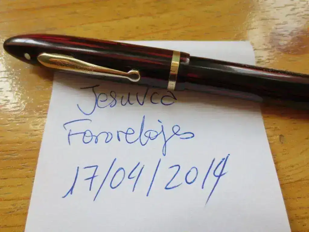 Vendo esta Sheaffer canadiense red carmine, más grande que el modelo americano, mide 14 cm cerrada, sobre unos 12 abierta. Se trata de un modelo de mitad de los años 40 con un celuloide precioso en un estado excepcional sin rayas ni marcas (altamente probable que esté pulida por su impecable estado), no existe desgaste significativo del oro, está en perfecto estado general y funcionando, el saco es nuevo y la carga es por palanca. He intentado con la cámara, cuesta captar la preciosidad del celuloide rojo, hay fotos donde se aprecia bien.