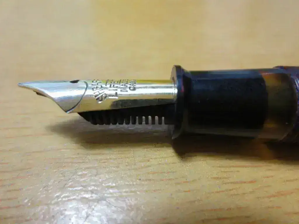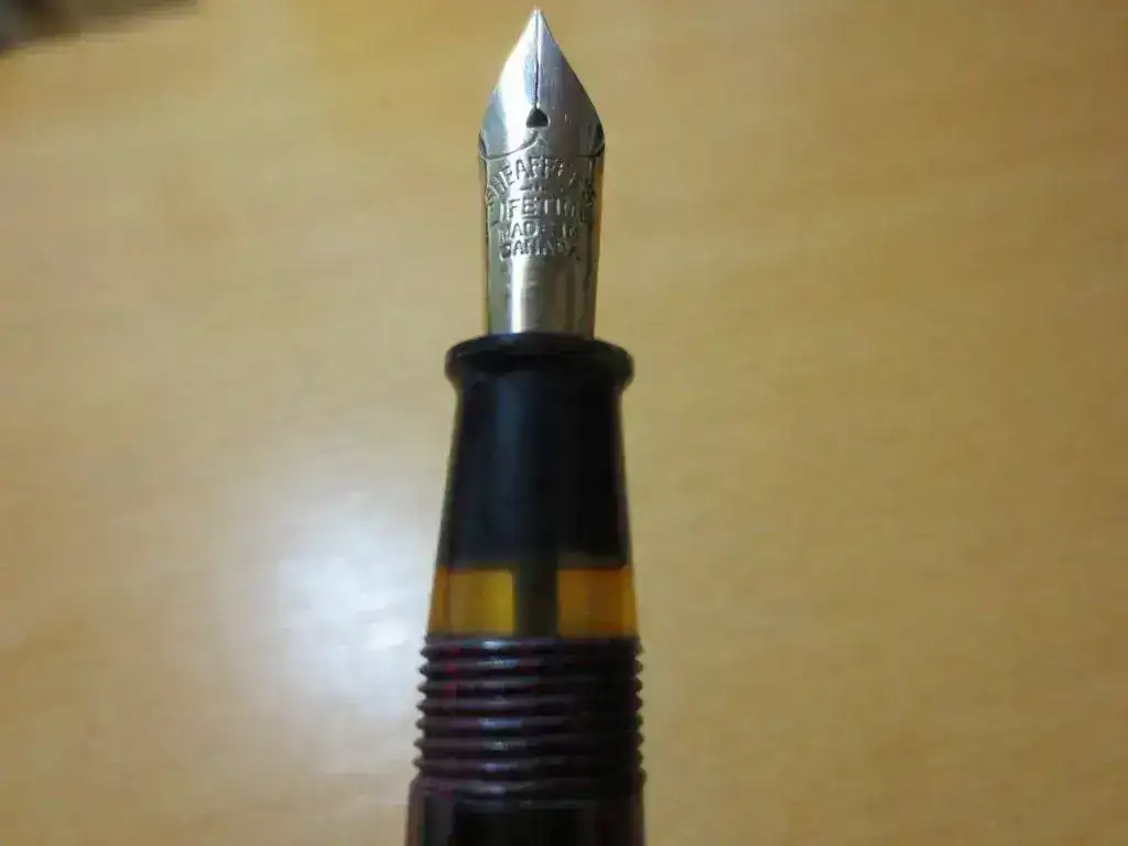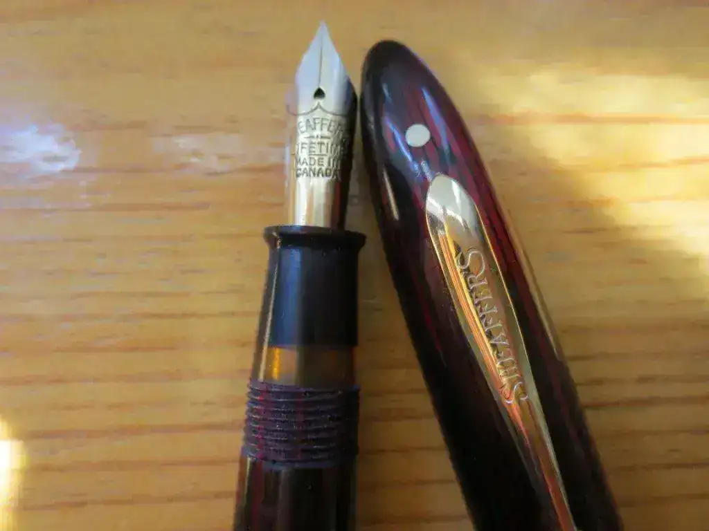 Su plumín es un bitono de 14 Kt, punto fino y como se puede ver con claridad en las fotos pone "Sheaffer Lifetime. Made in Canada".