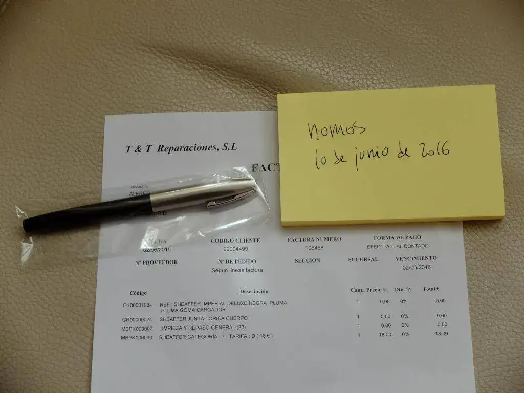 La retiré el día 2 de junio pasado de T and T reparaciones, en donde la hicieron un repaso general, la cambiaron la junta tórica y repusieron el cargador. El sistema de carga es touchdown. Por supuesto, tengo la factura que acredita todo esto, que entregaré al comprador, y que sirve de garantía ante cualquier problema que pudiera tener la pluma. Está, por tanto, como nueva por dentro, y también por fuera, y desde que la saqué del taller no la he cargado, está sin entintar desde que la revisaron.