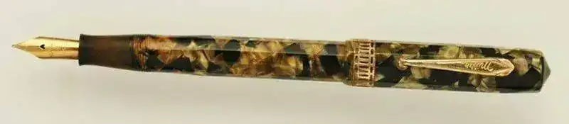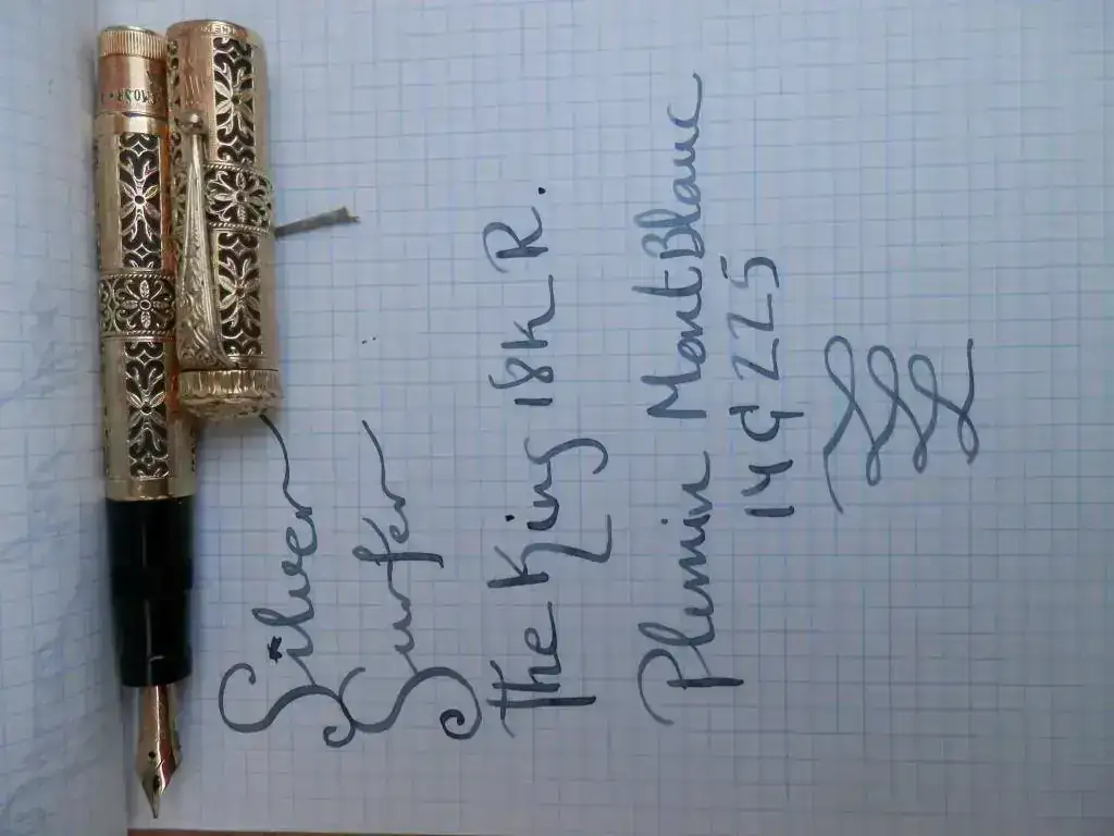 Para empezar, este ejemplo. Una Miller 693, realizada en celuloide, poco conocida, que monta un plumín de 14 kt flexible (IR2), empleando tinta Montblanc royal blue reserva de los años 90.