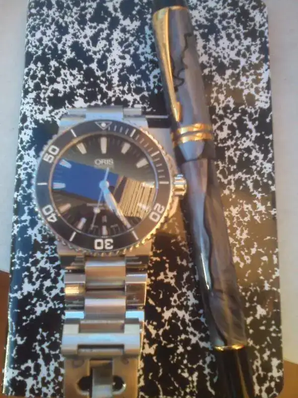 Ya lo puse más arriba en el mismo hilo, de los que tengo el Oris Aquis ,el más fuerte, el más impactante, hay otros similares que me gustan pero de los que yo tengo este, de hecho cuando estoy un tiempo sin llevarlo echo de menos el peso de su acero. CAM00115.webpY acompañado de la Parker Duofold para poder escribir algo.