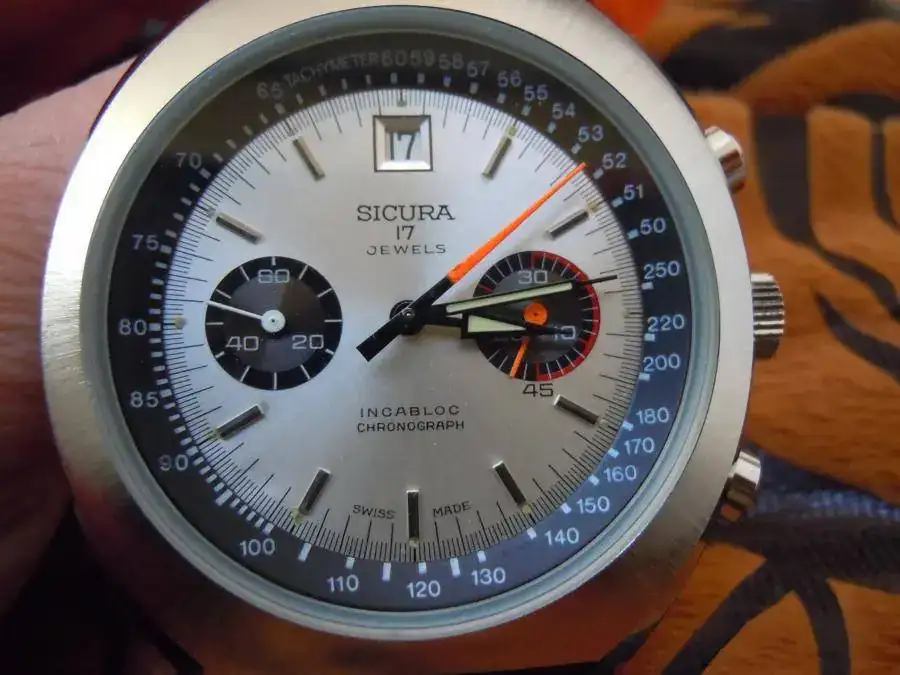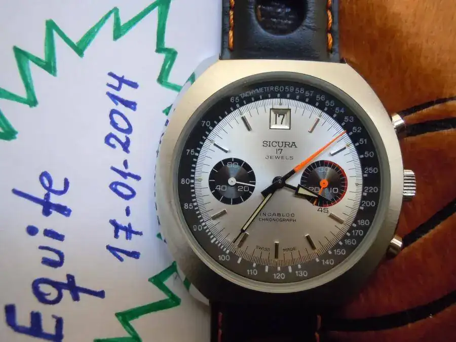 Maquinaria Valjoux 7734, la misma que se montaba en los Autavia de Heuer, Breitling, etc ..de los relojes de la misma época. Tiene la fecha a las 12, lo cual es un detalle muy poco visto en Chrono de esta época, lo cual lo hace bastante especial y muy coleccionable.