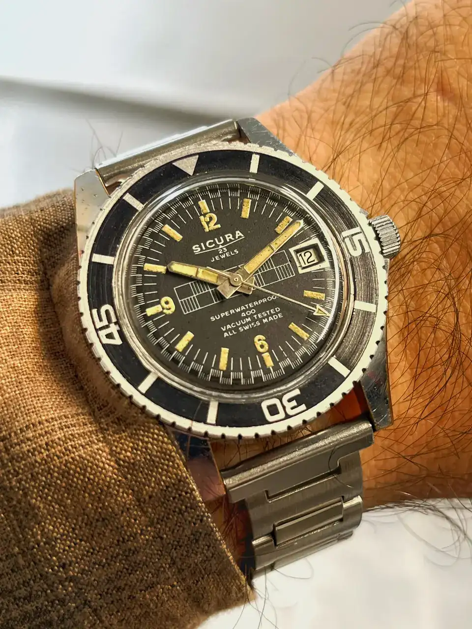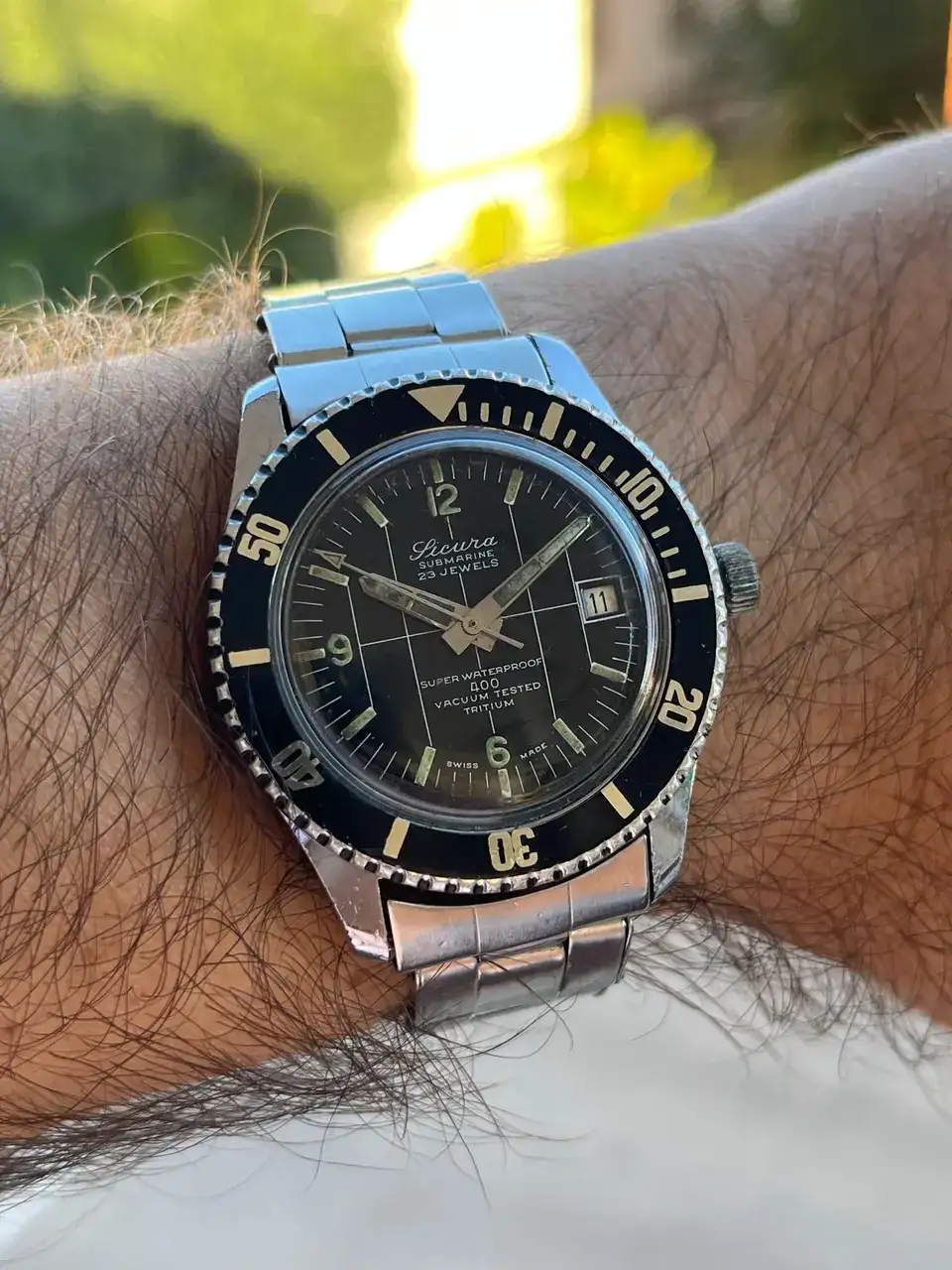Estaba paseando por un mercadillo con el serio propósito de no adquirir ningún reloj más. Pero en una vitrina estaba este Sicura, con otros relojes también muy majos. Pero este me atrajo y tras corta negociación se vino para casa.